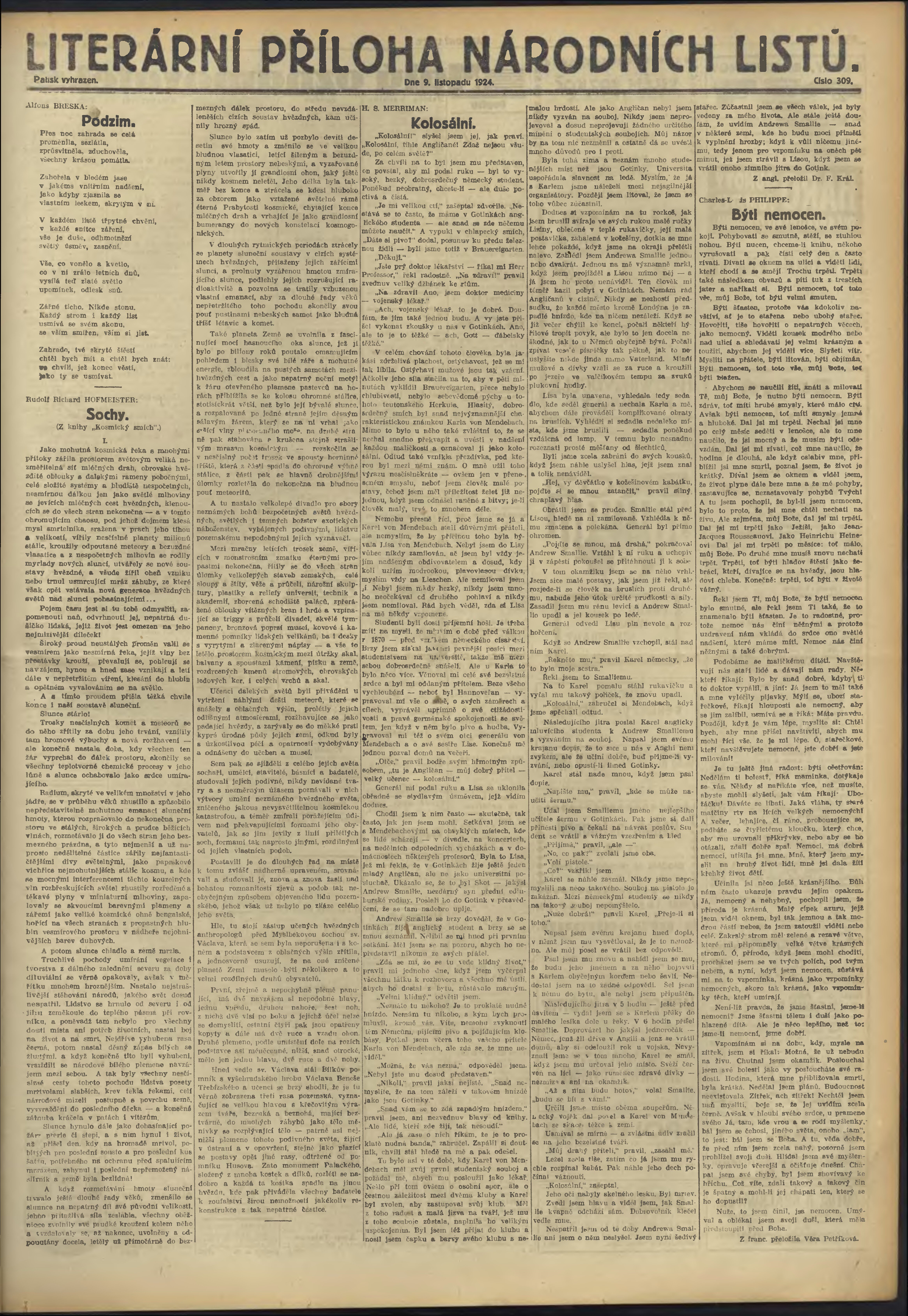 * Datum vydání výtisku: 9.11.1924 Číslo výtisku: 309 Typ výtisku: příloha