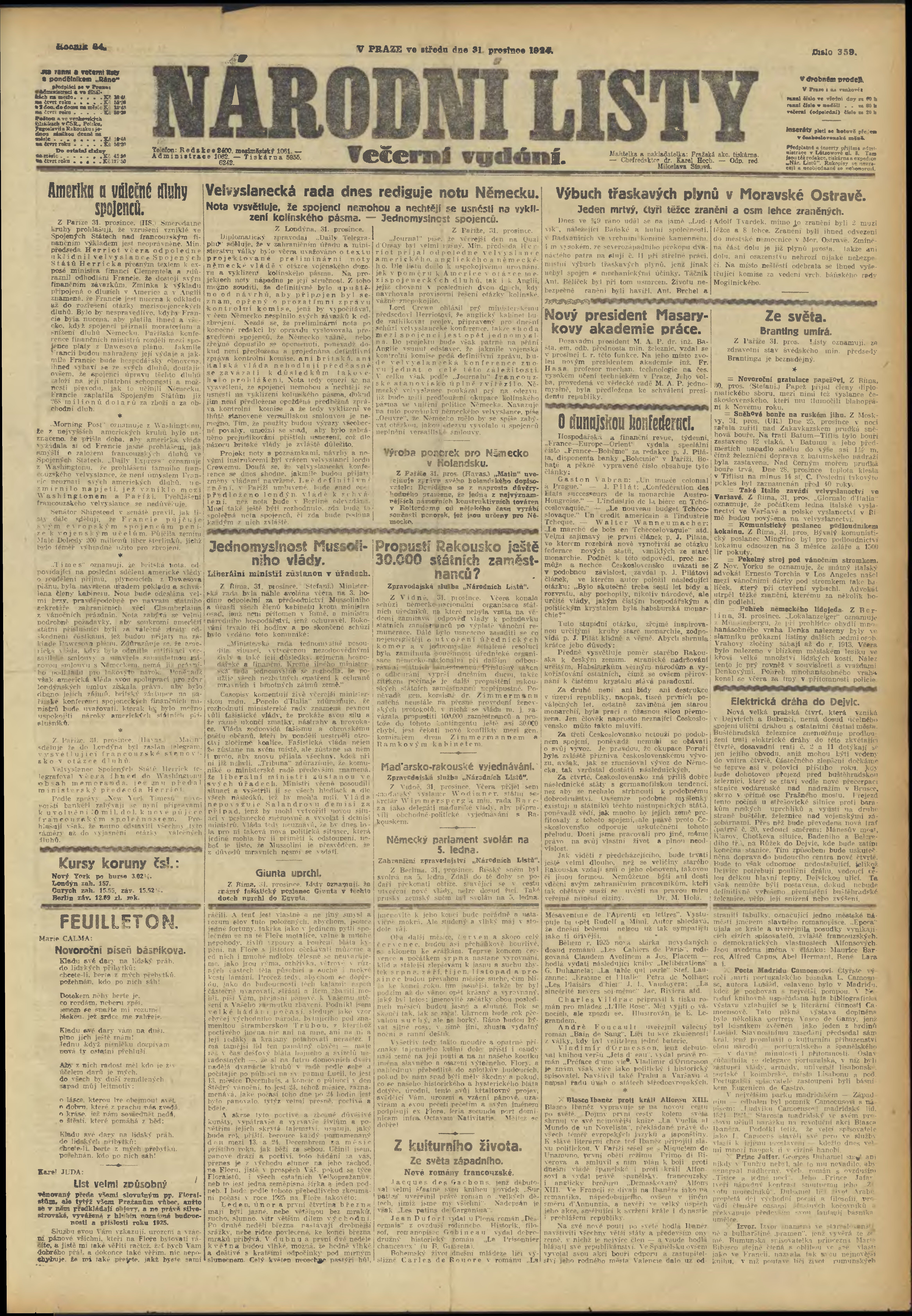 * Datum vydání výtisku: 31.12.1924 Číslo výtisku: 359 Poznámky k výtisku: večerní vydání;