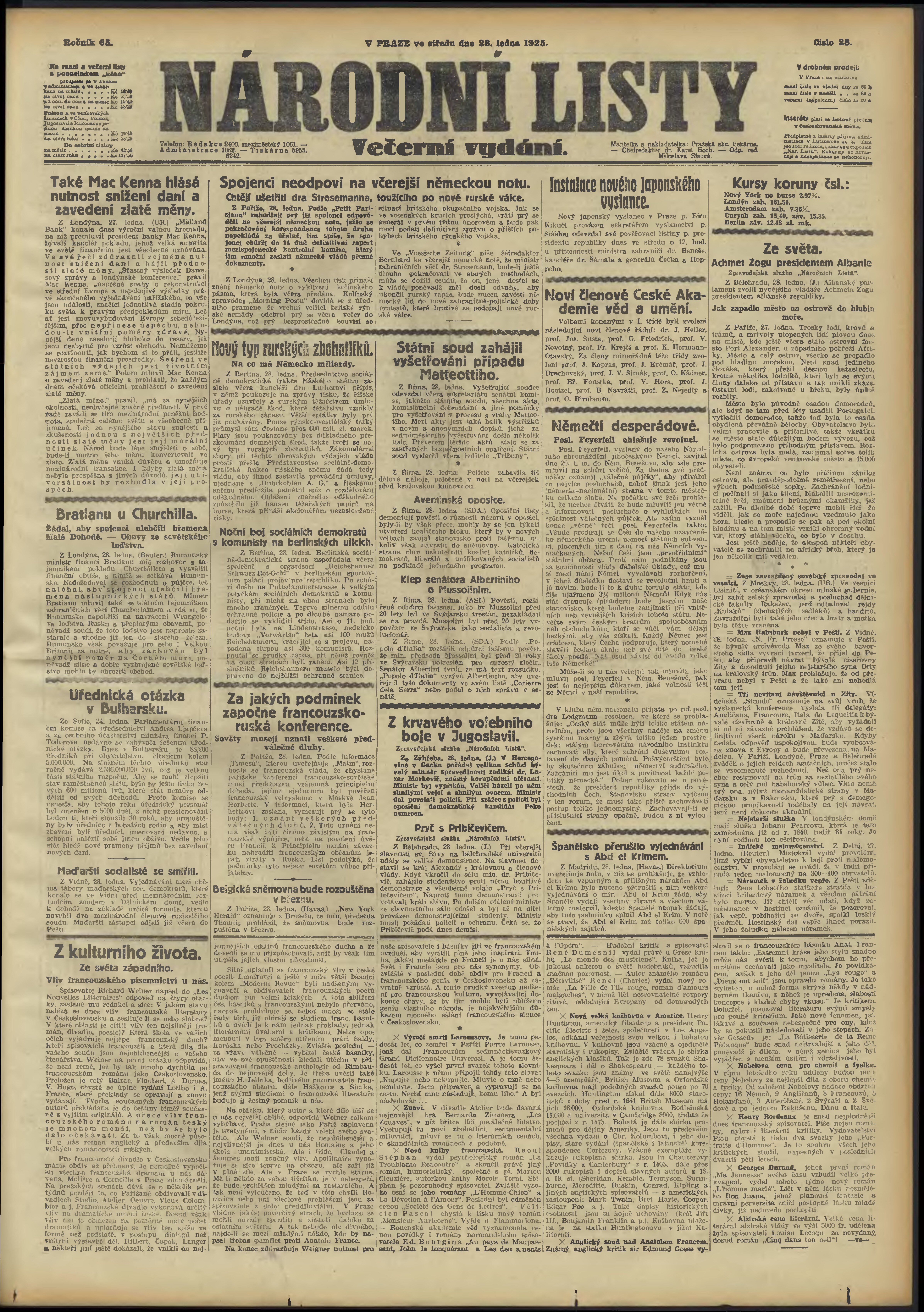 * Datum vydání výtisku: 28.1.1925 Číslo výtisku: 28 Poznámky k výtisku: večerní vydání;