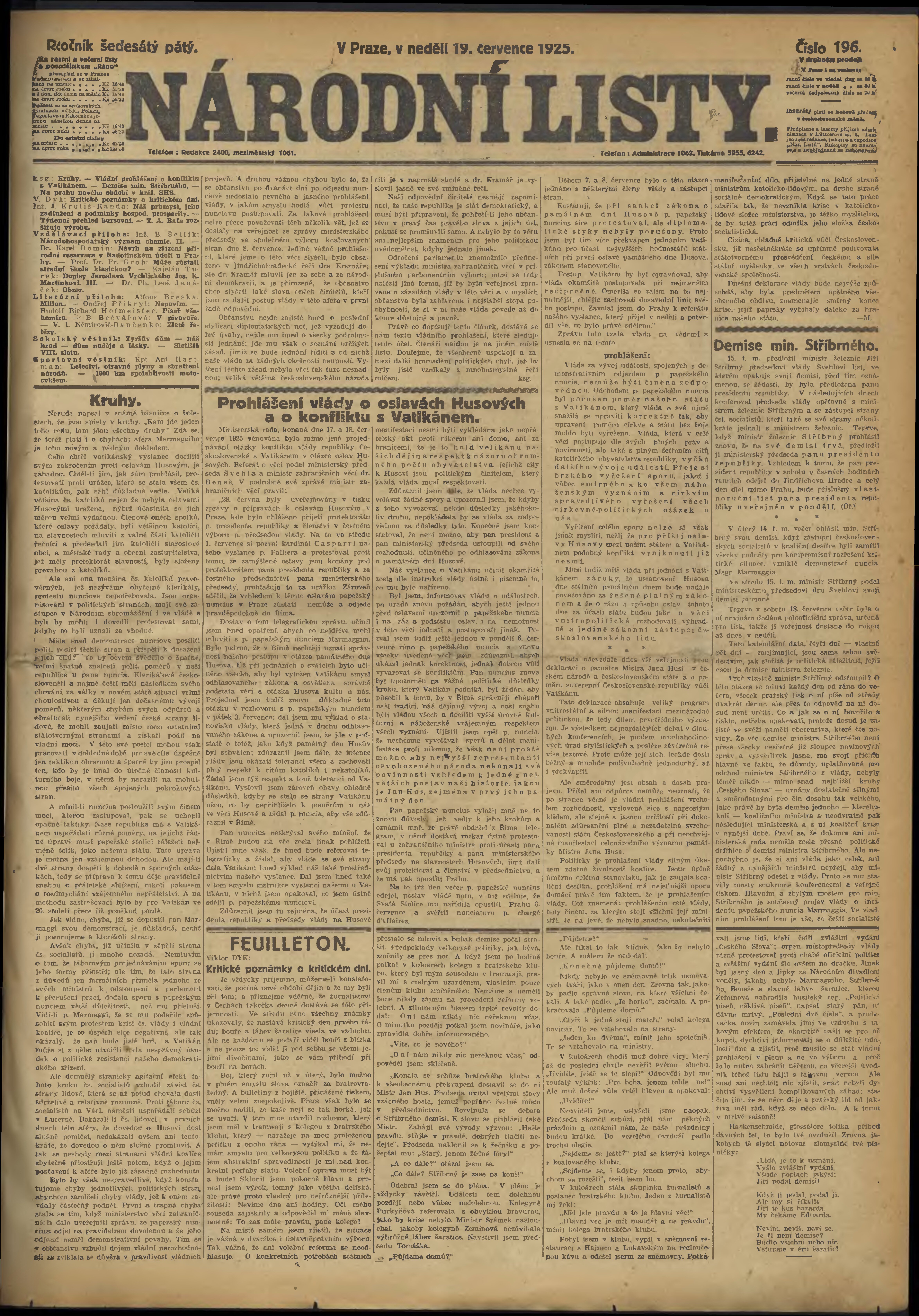 * Datum vydání výtisku: 19.7.1925 Číslo výtisku: 196