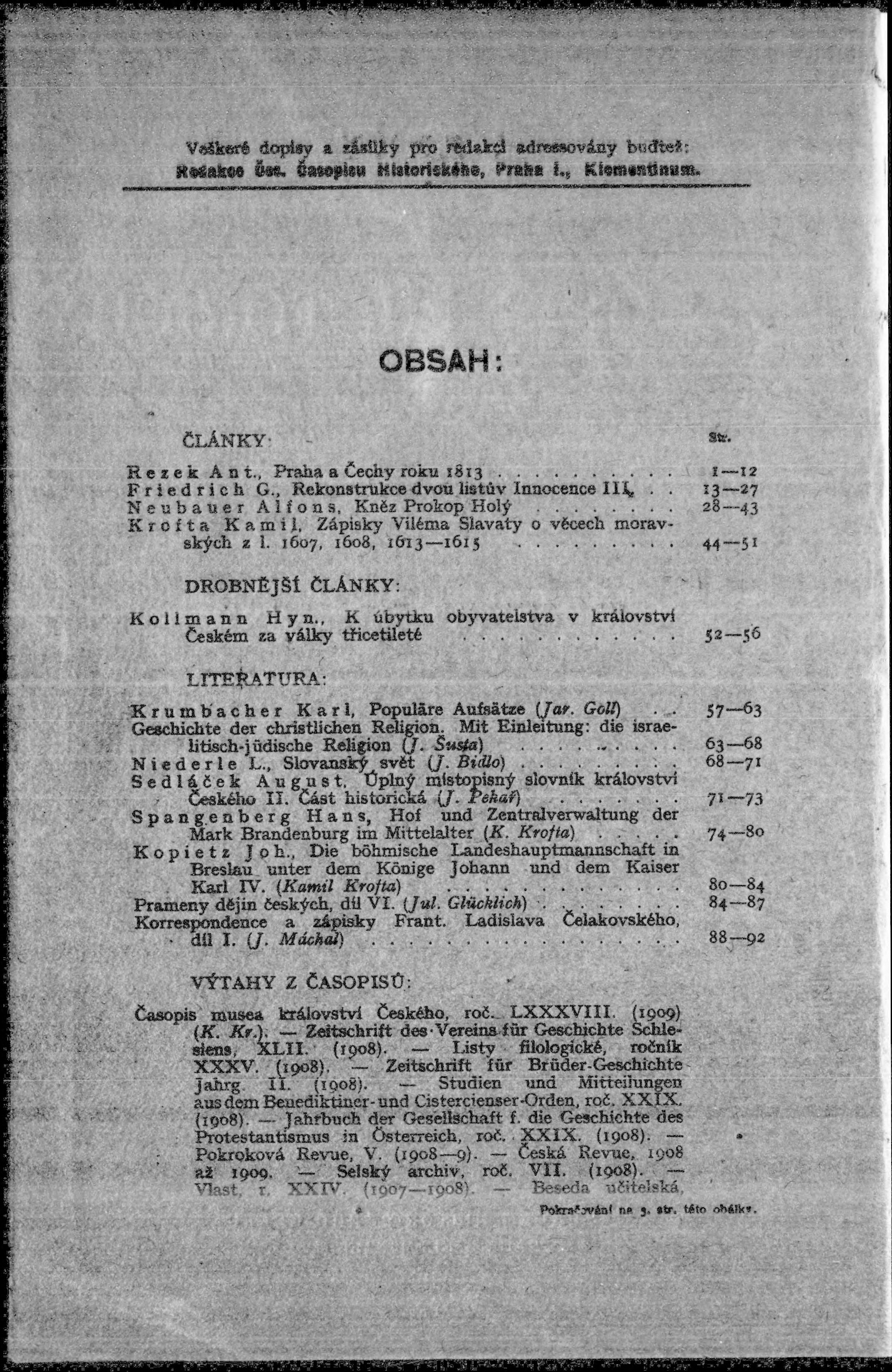 * Datum vydání výtisku: 15.1.1910 Číslo výtisku: 1 Poznámky k výtisku: s. (1) - (1a) nekvalitní předloha;