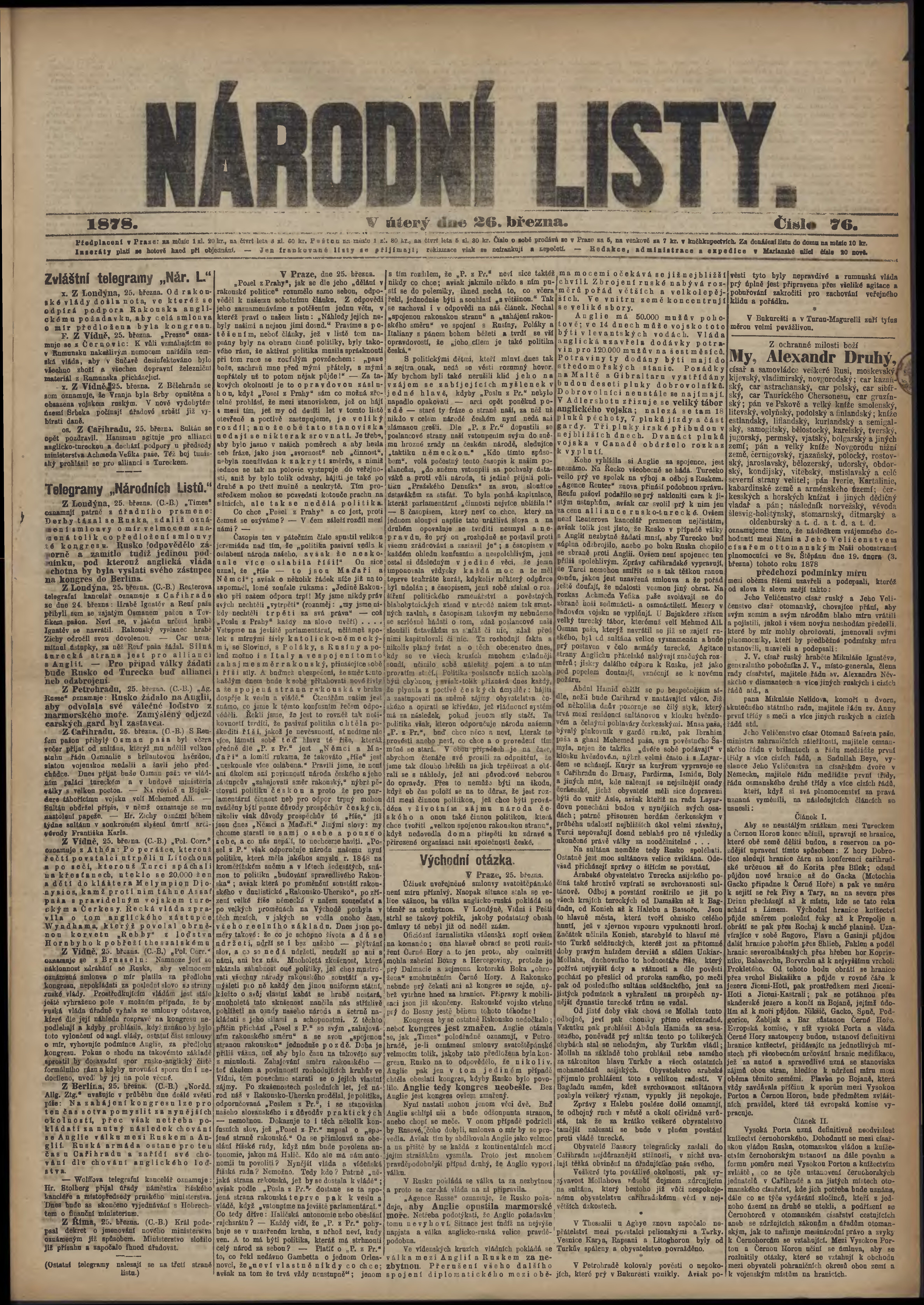 * Datum vydání výtisku: 26.3.1878 Číslo výtisku: 76