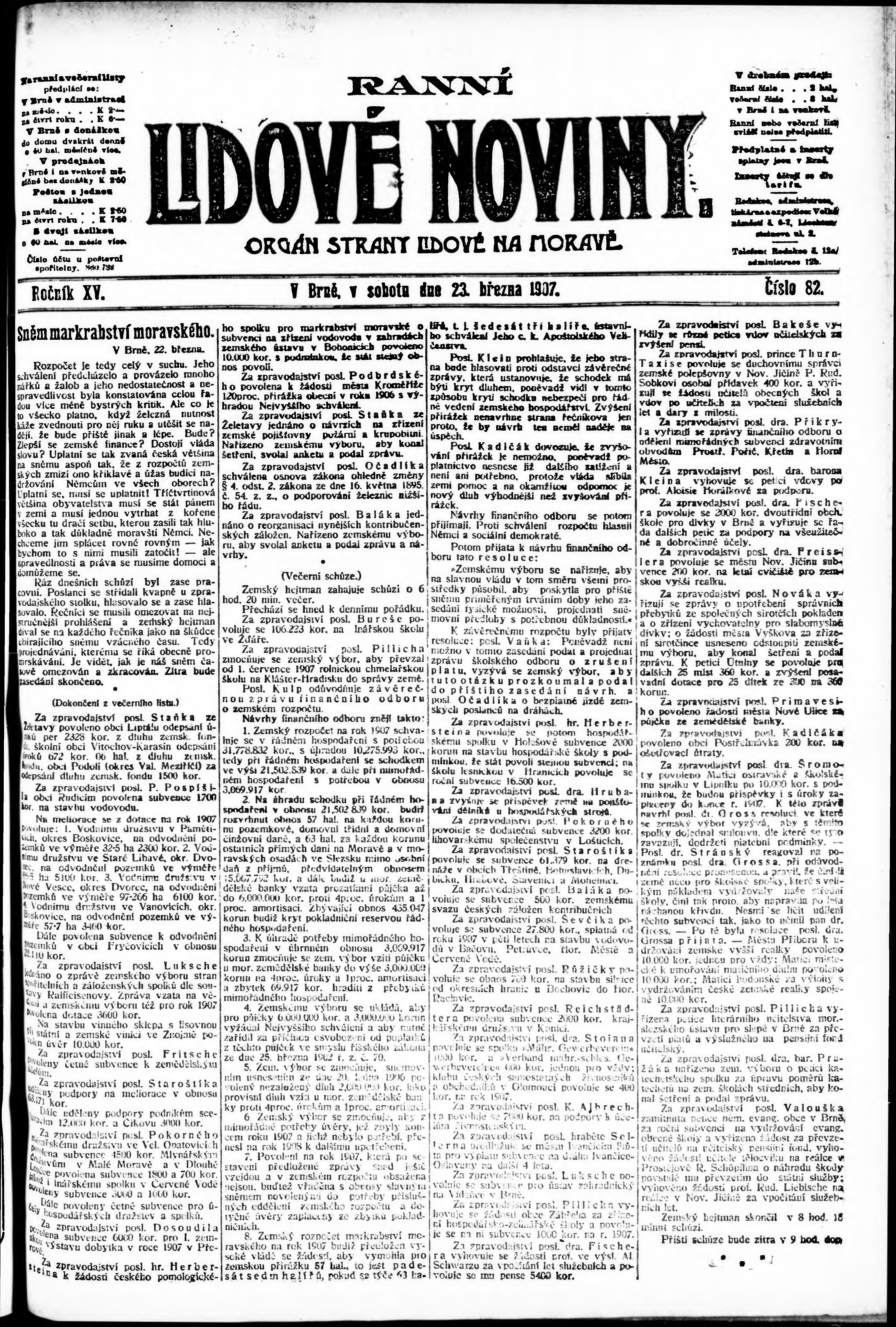 * Datum vydání výtisku: 23.3.1907 Číslo výtisku: 82 Poznámky k výtisku: ranní vydání;