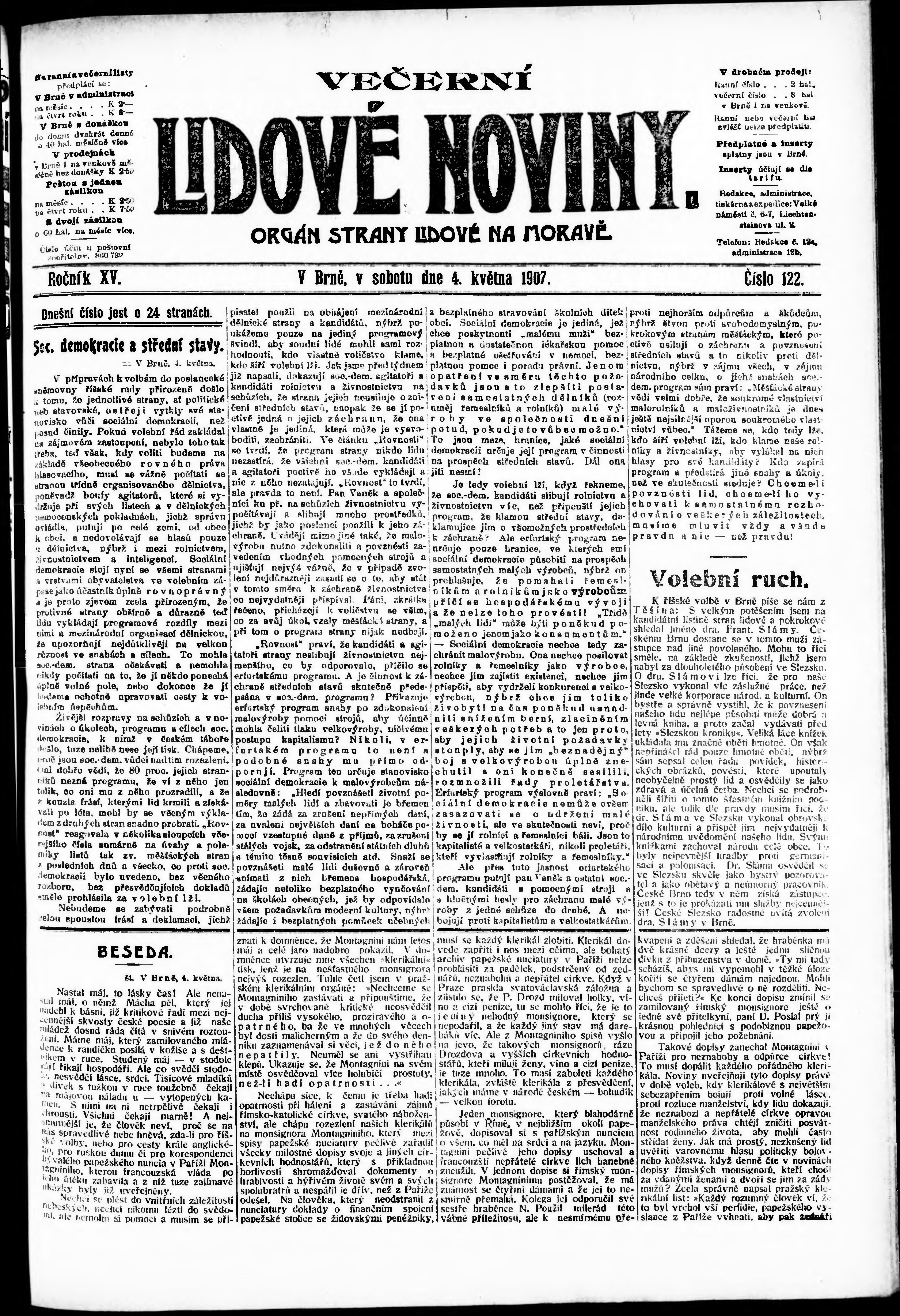 * Datum vydání výtisku: 4.5.1907 Číslo výtisku: 122 Poznámky k výtisku: večerní vydání;