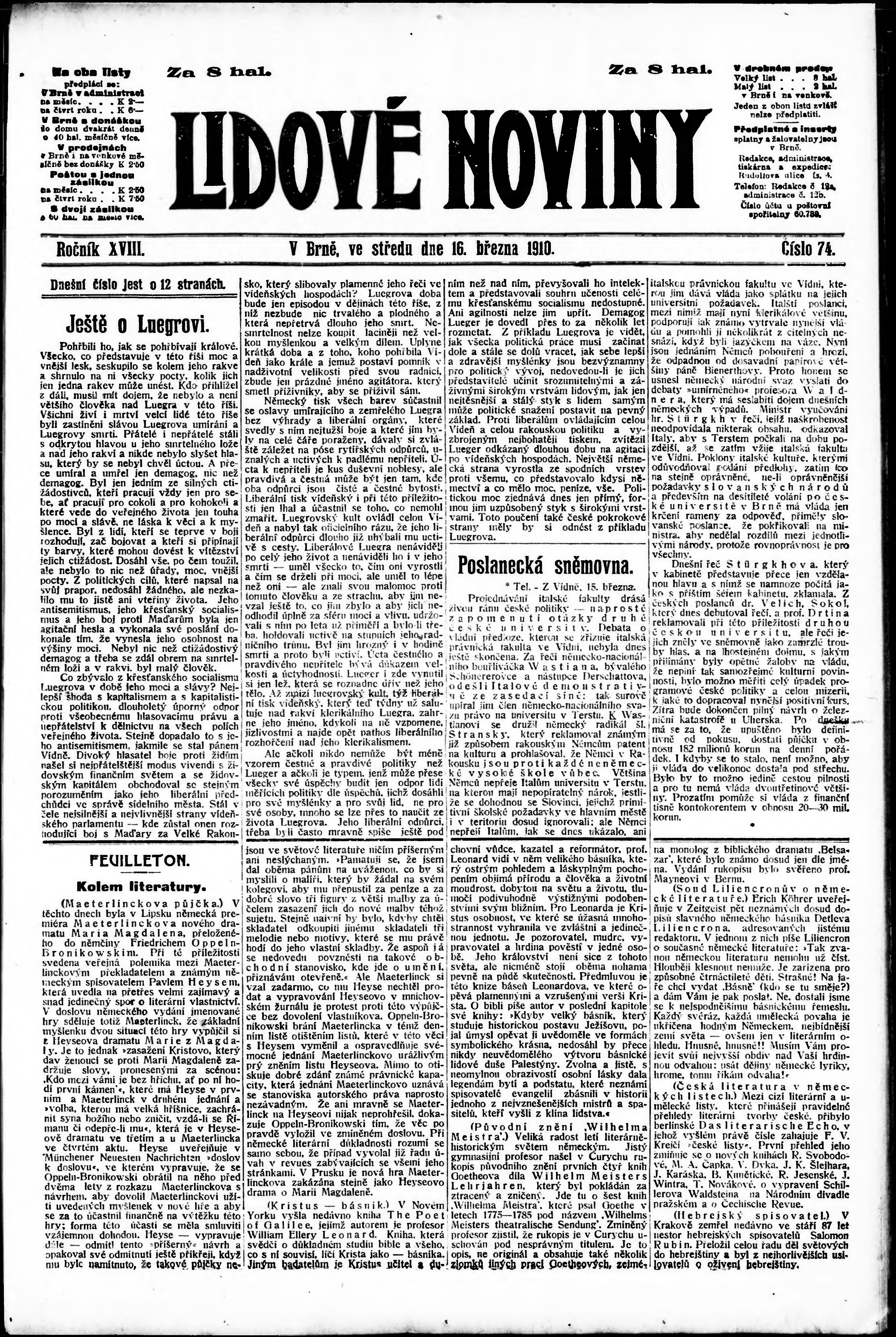 * Datum vydání výtisku: 16.3.1910 Číslo výtisku: 74