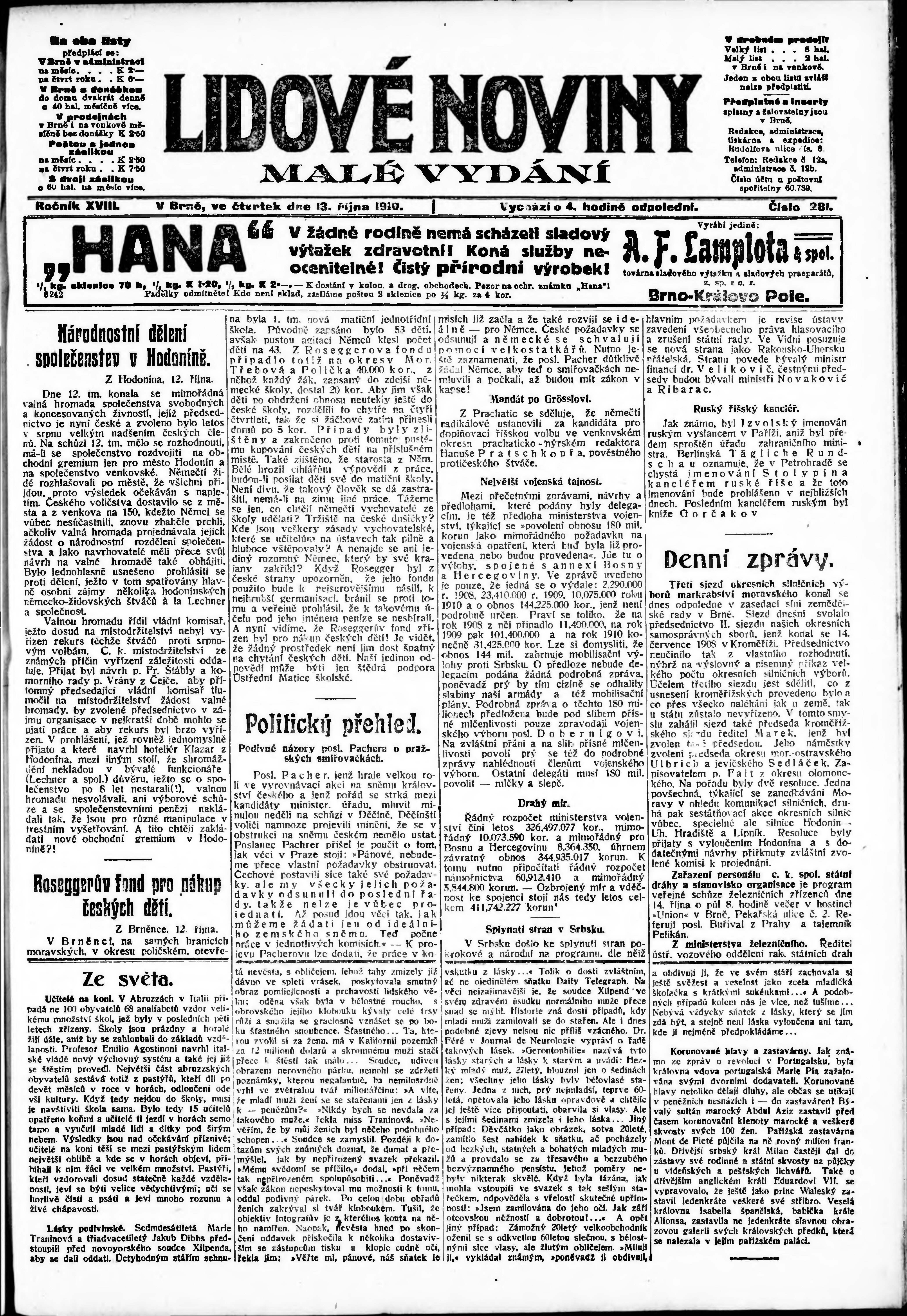 * Datum vydání výtisku: 13.10.1910 Číslo výtisku: 281 Poznámky k výtisku: malé vydání;