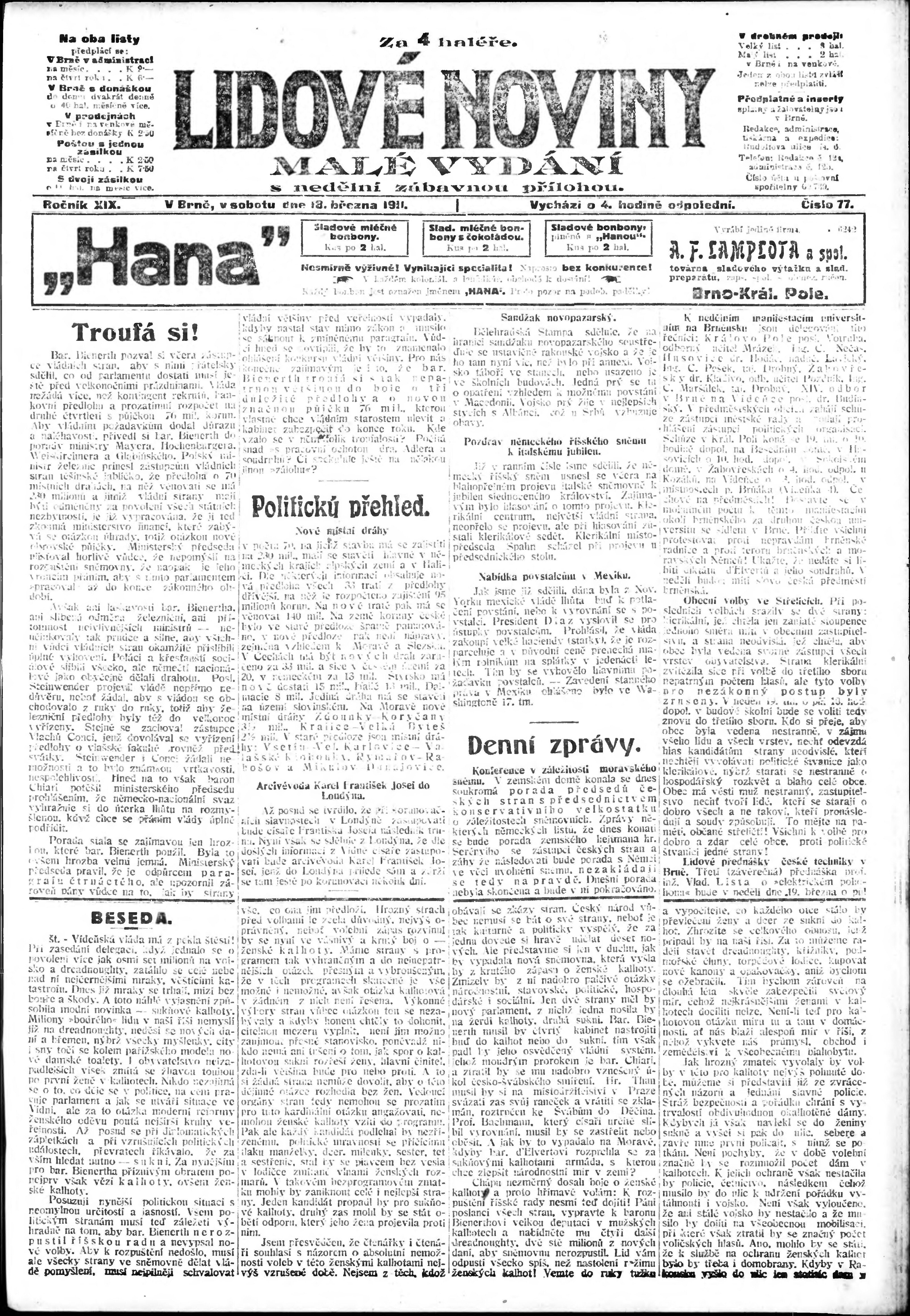 * Datum vydání výtisku: 18.3.1911 Číslo výtisku: 77 Poznámky k výtisku: malé vydání s nedělní zábavnou přílohou;