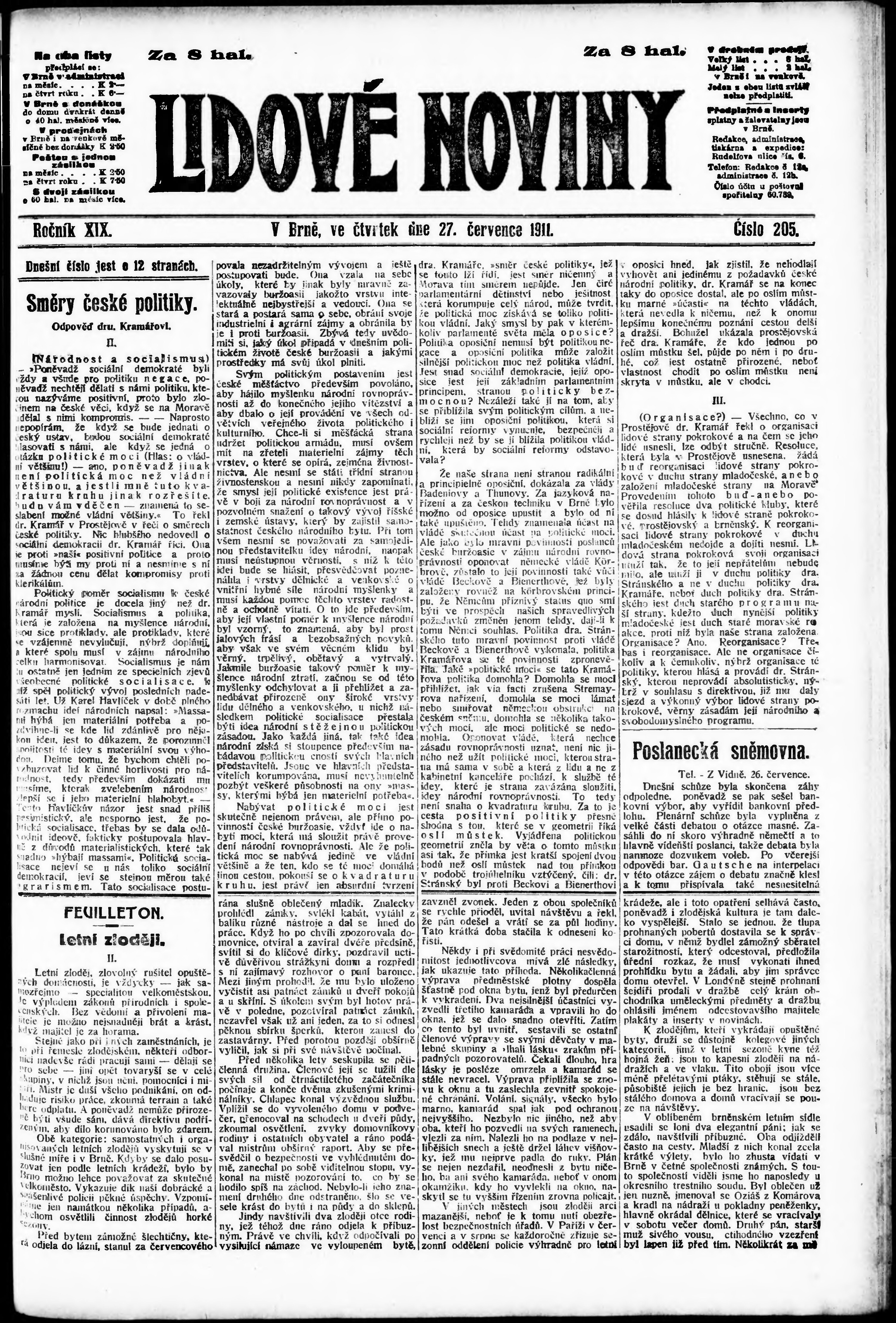 * Datum vydání výtisku: 27.7.1911 Číslo výtisku: 205