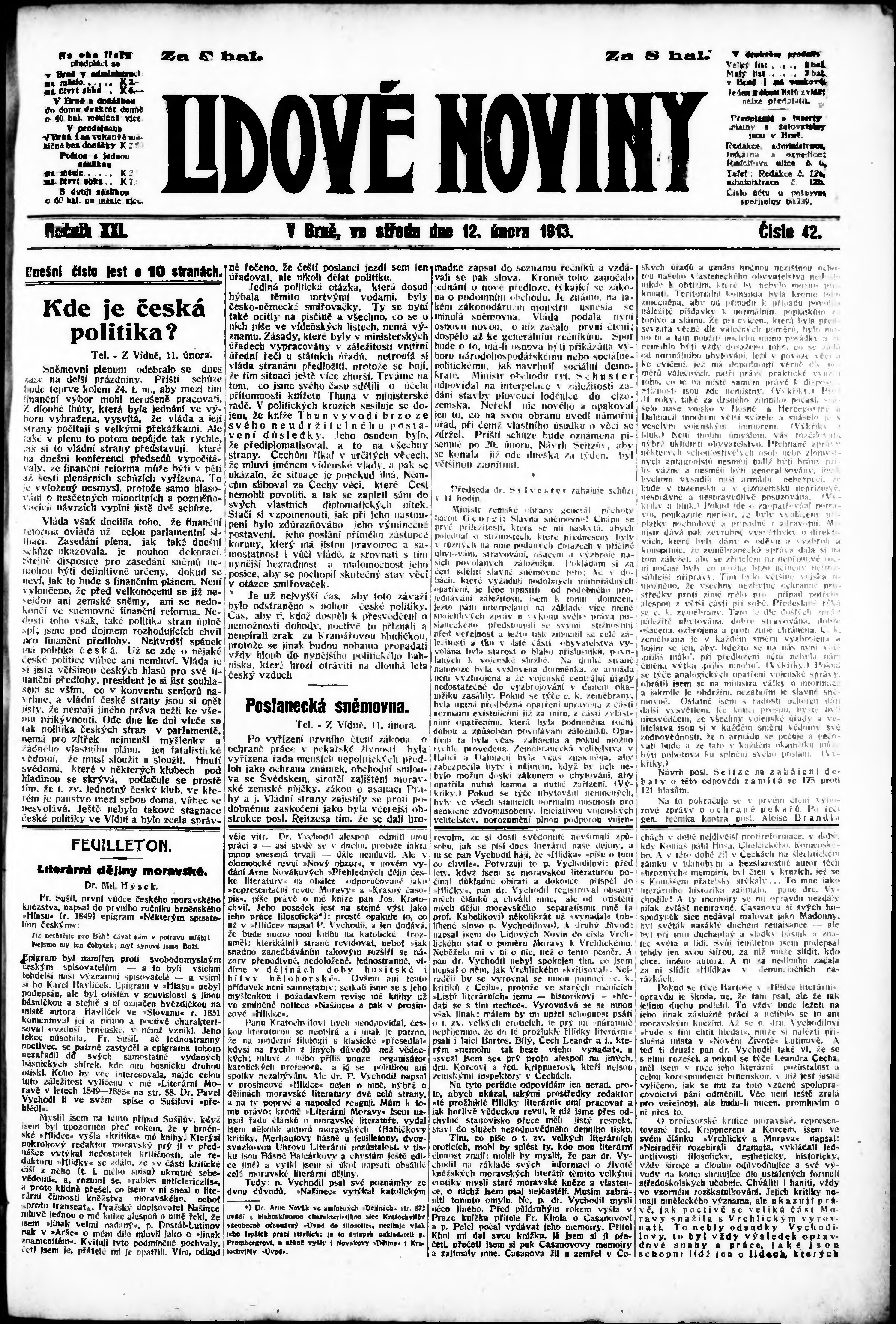 * Datum vydání výtisku: 12.2.1913 Číslo výtisku: 42