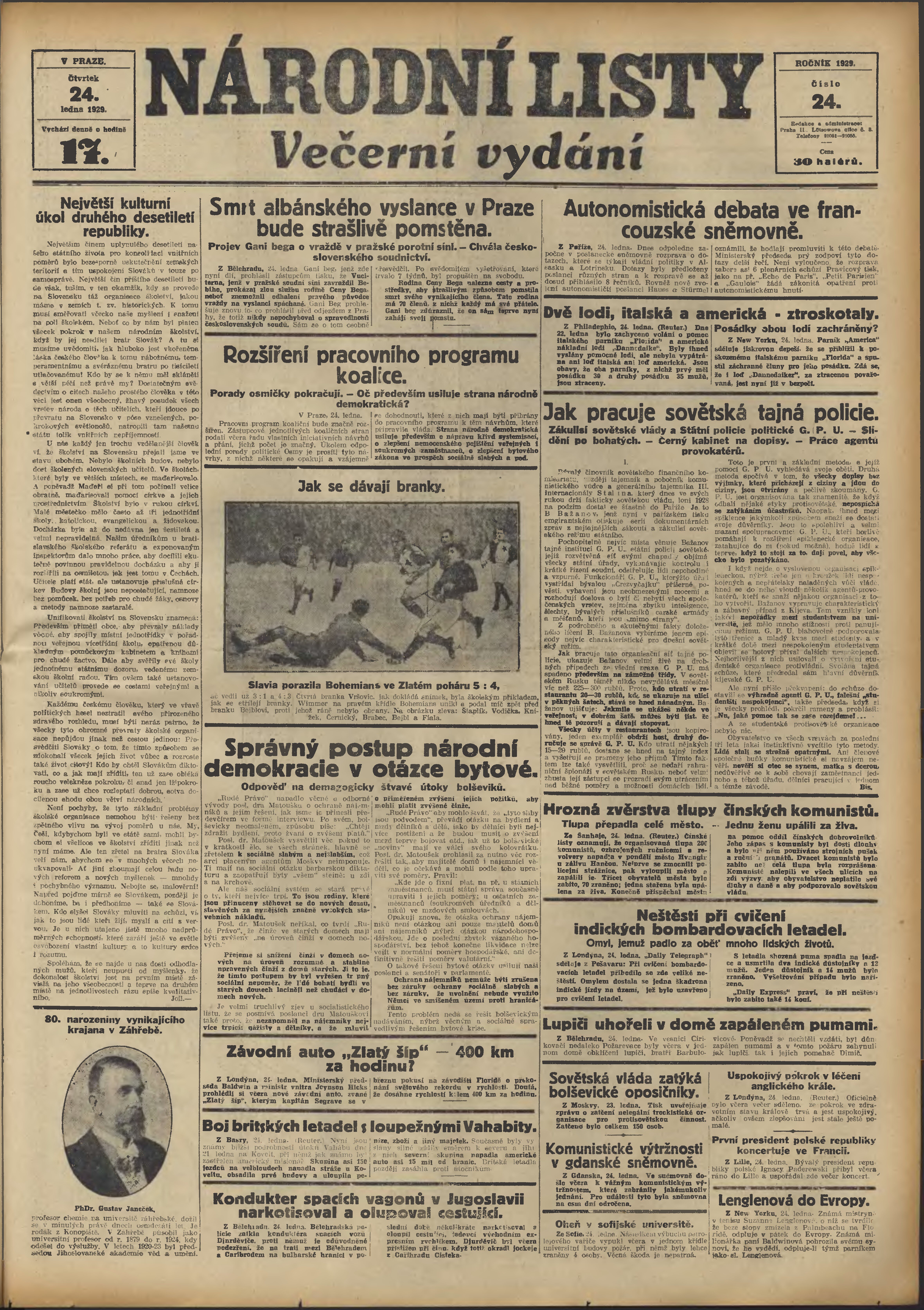 * Datum vydání výtisku: 24.1.1929 Číslo výtisku: 24 Poznámky k výtisku: večerní vydání;