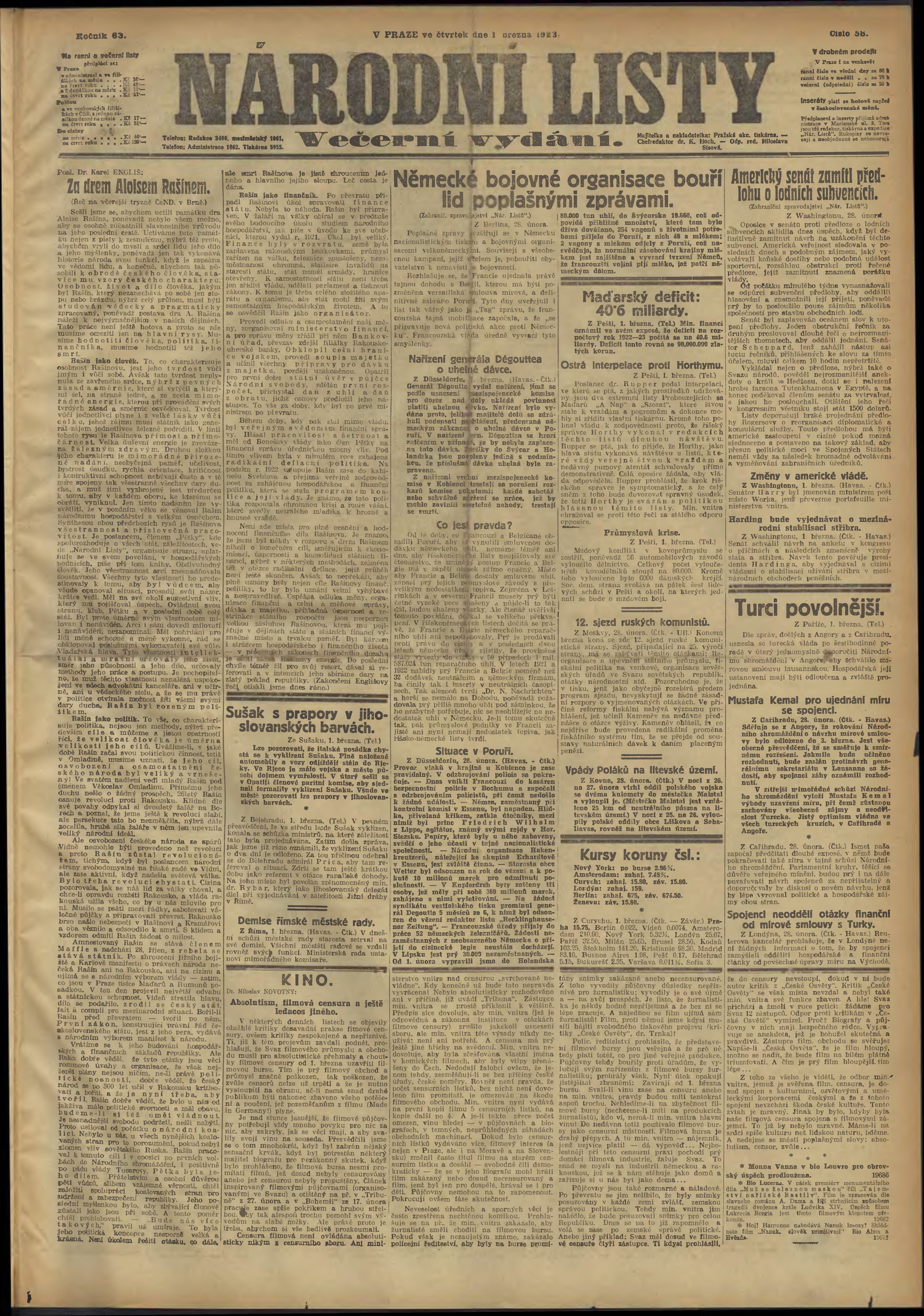 * Datum vydání výtisku: 1.3.1923 Číslo výtisku: 58 Poznámky k výtisku: večerní vydání;