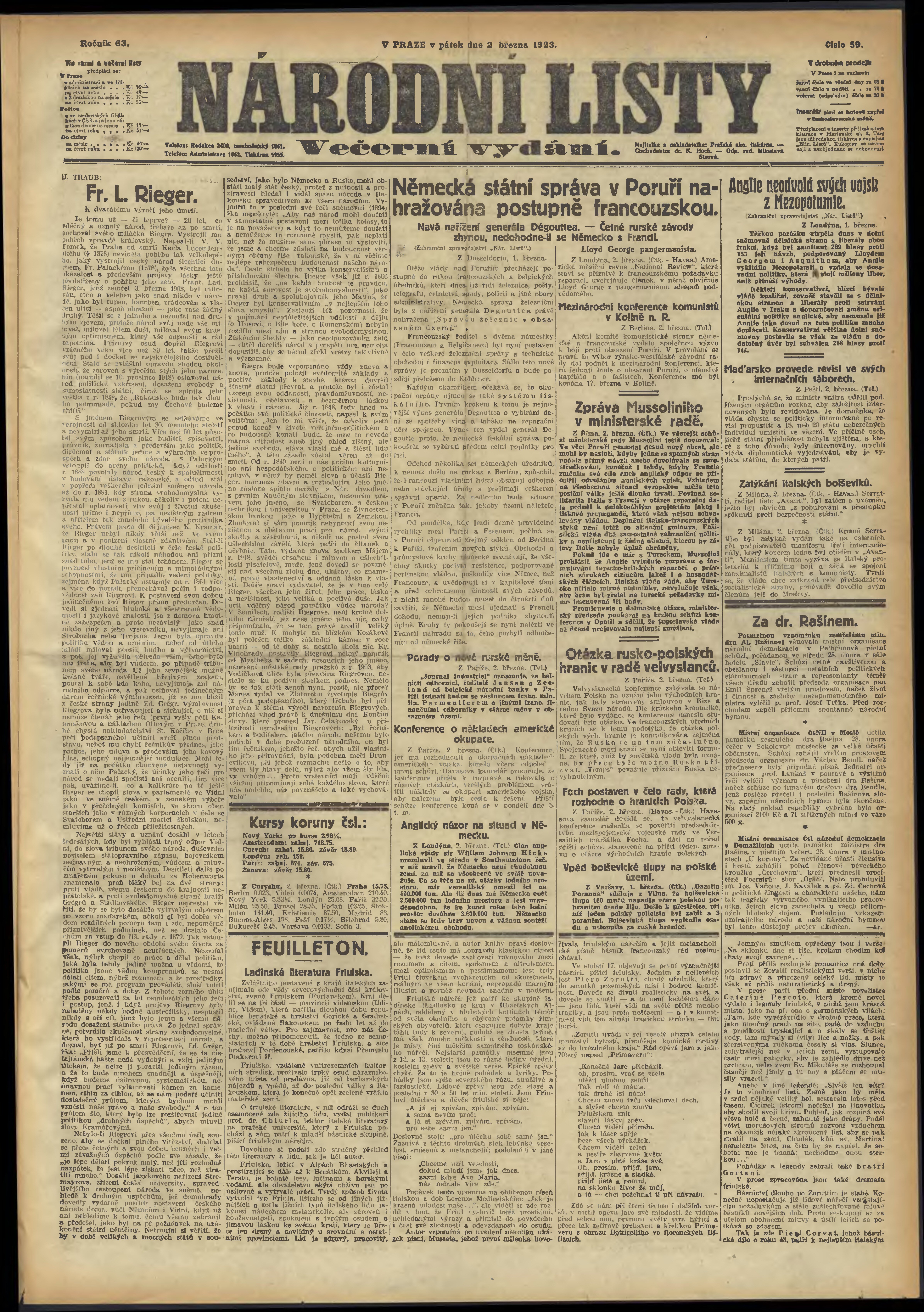 * Datum vydání výtisku: 2.3.1923 Číslo výtisku: 59 Poznámky k výtisku: večerní vydání;