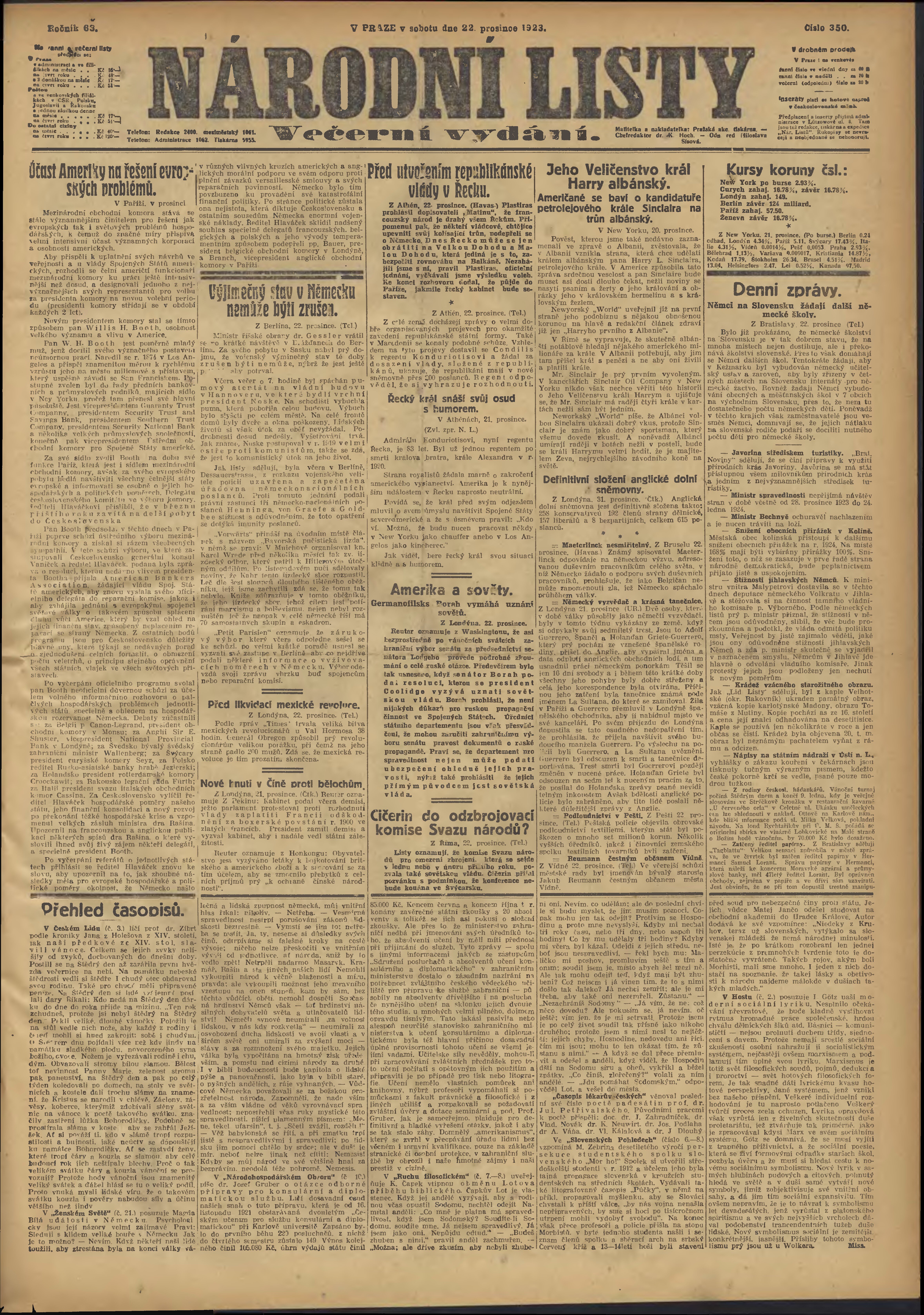 * Datum vydání výtisku: 22.12.1923 Číslo výtisku: 350 Poznámky k výtisku: večerní vydání;