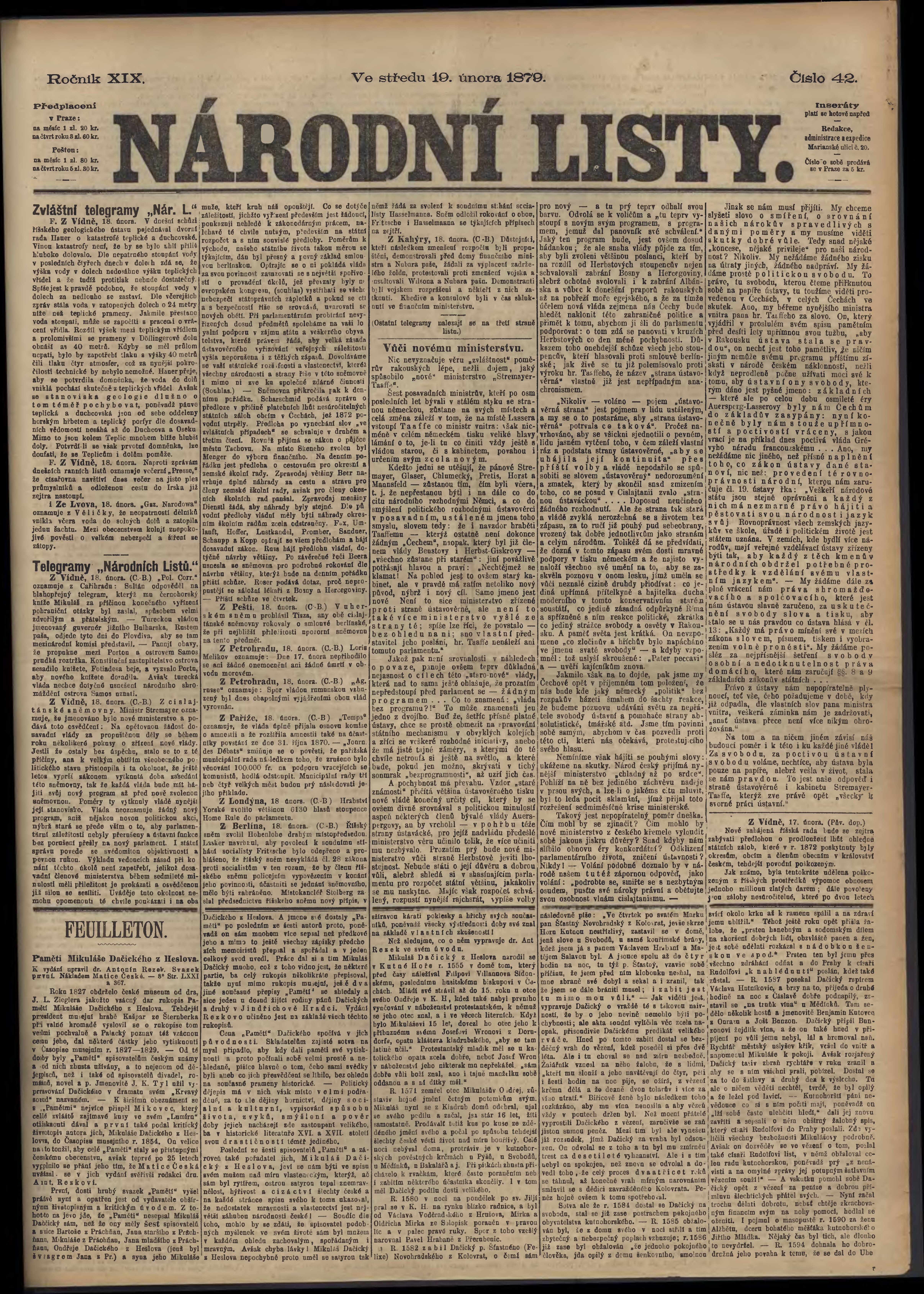 * Datum vydání výtisku: 19.2.1879 Číslo výtisku: 42
