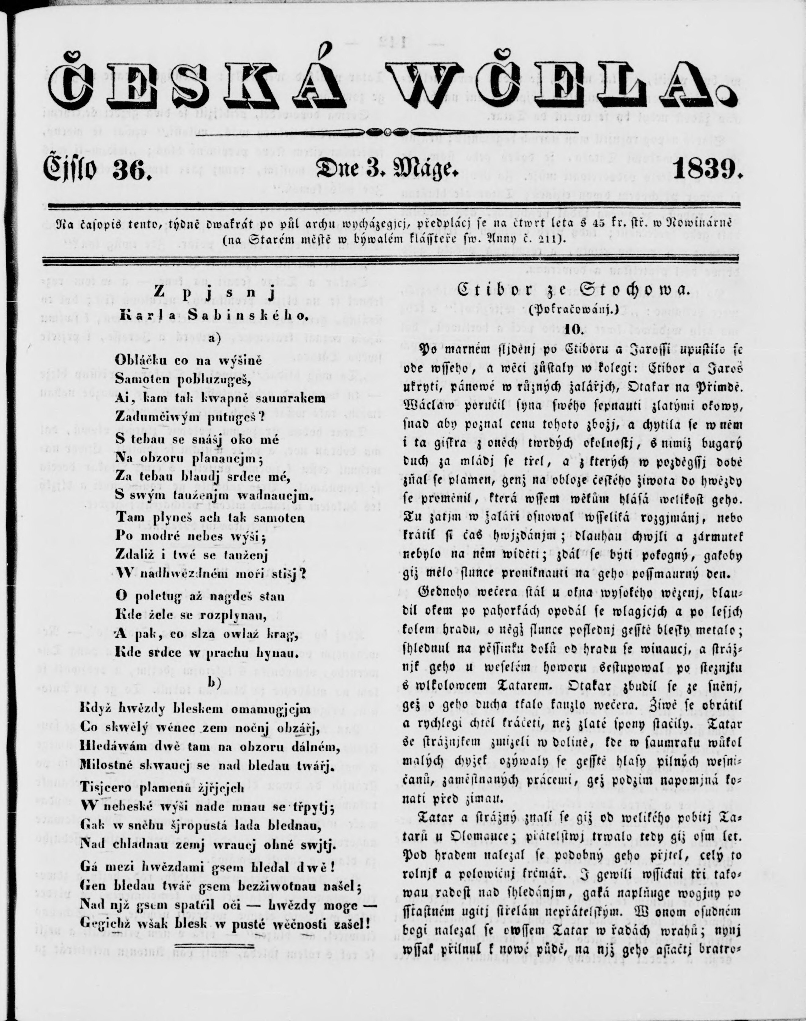 * Datum vydání výtisku: 5.5.1839 Číslo výtisku: 36