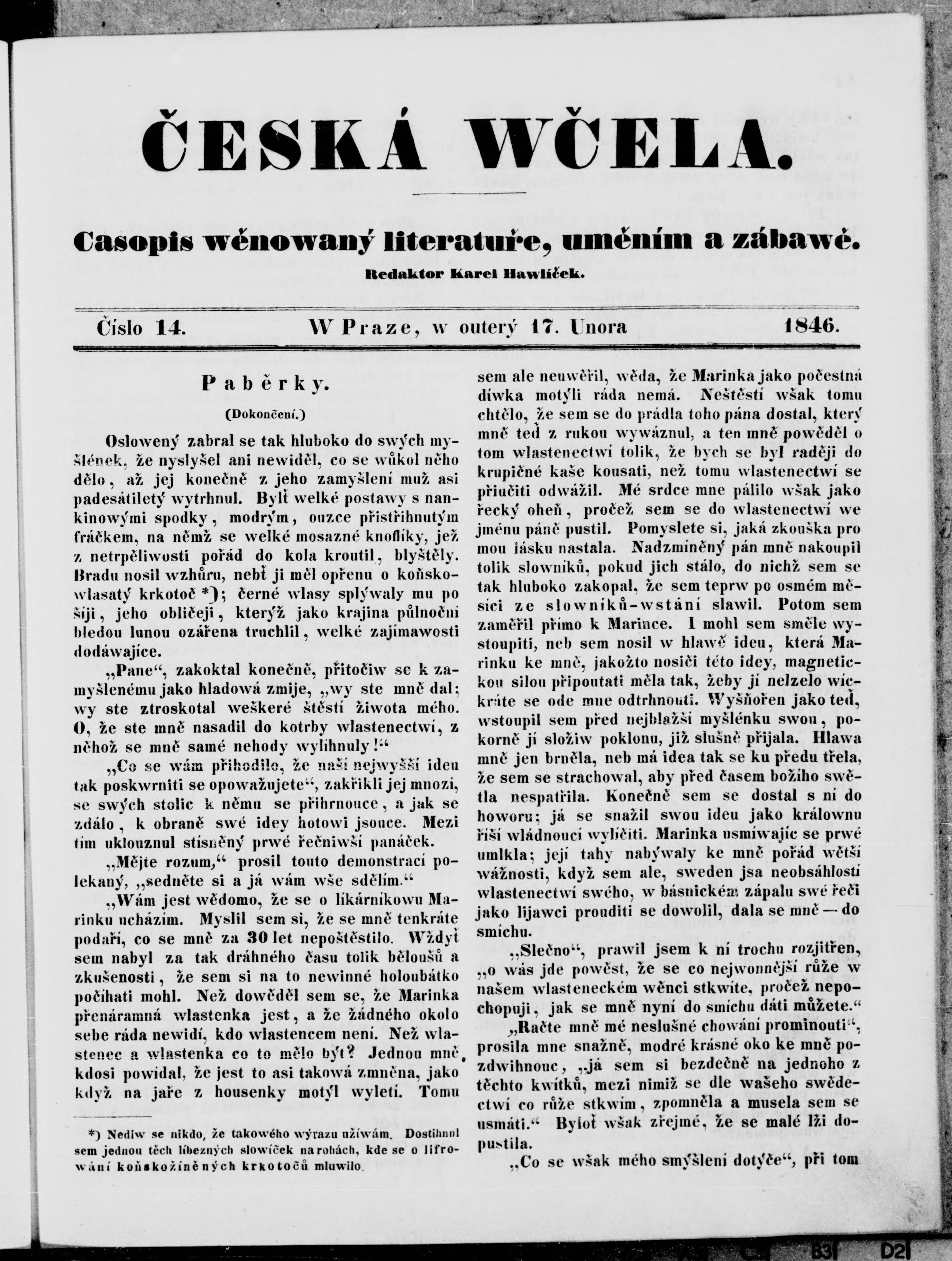 * Datum vydání výtisku: 17.2.1846 Číslo výtisku: 14
