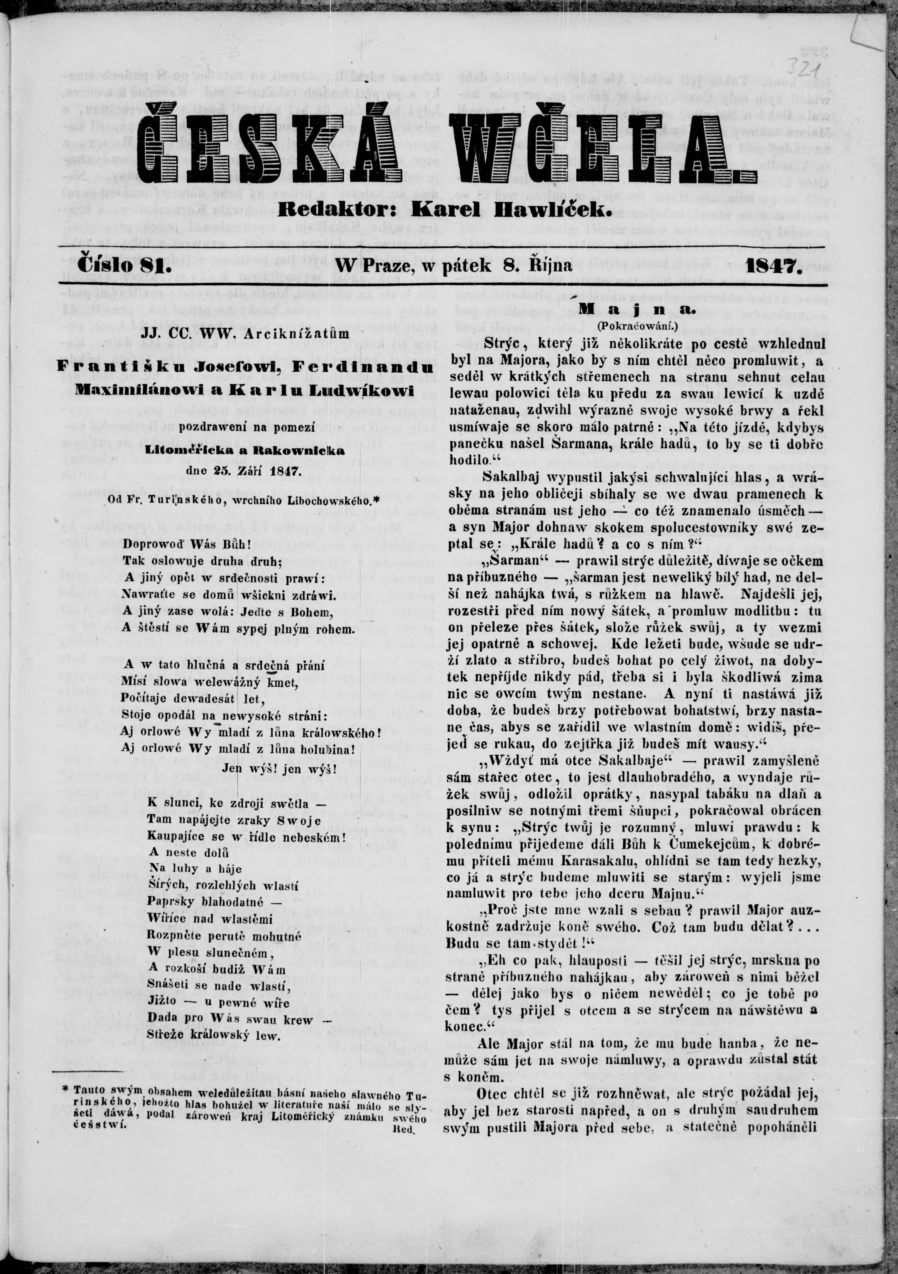 * Datum vydání výtisku: 8.10.1847 Číslo výtisku: 81