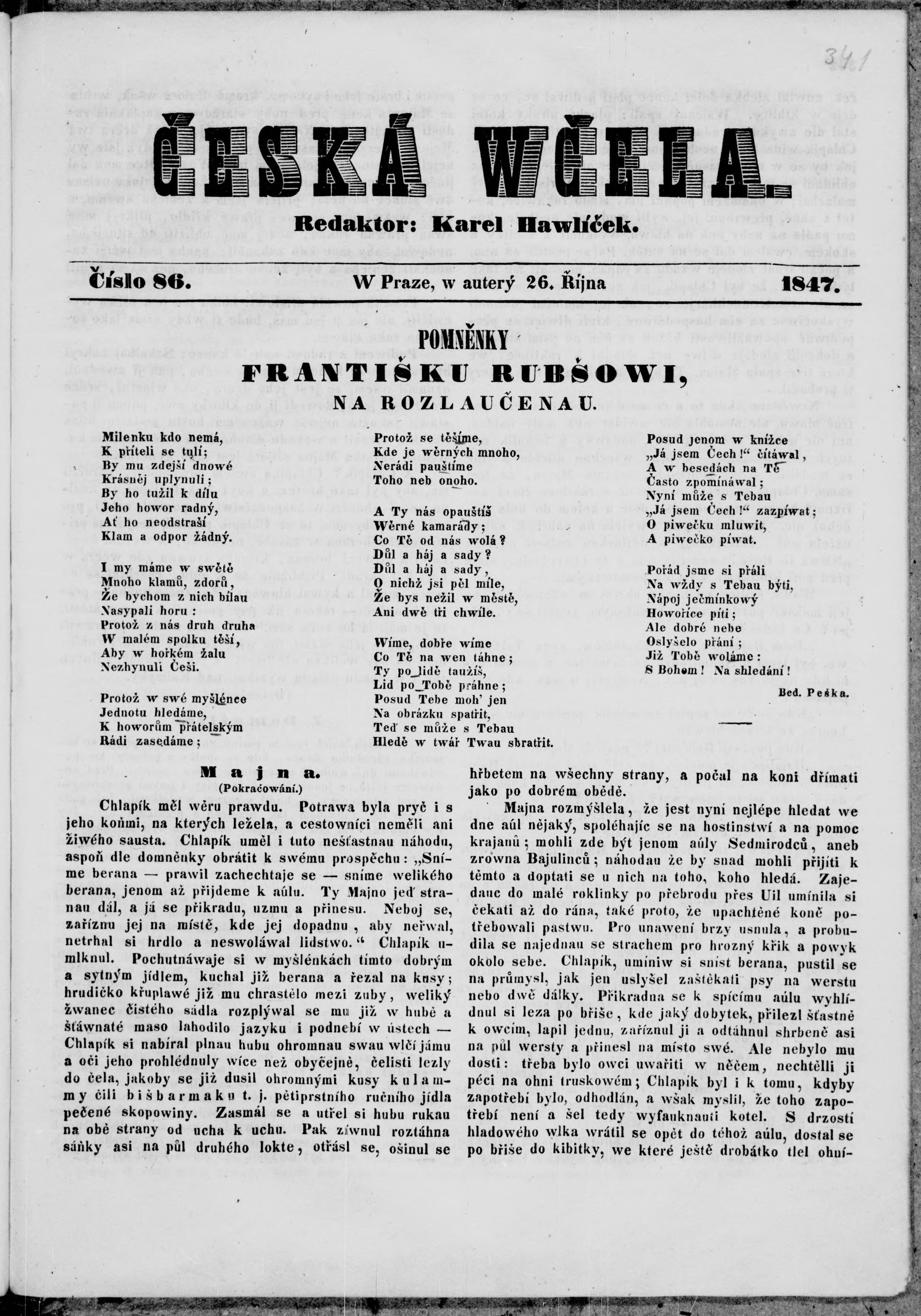 * Datum vydání výtisku: 26.10.1847 Číslo výtisku: 86