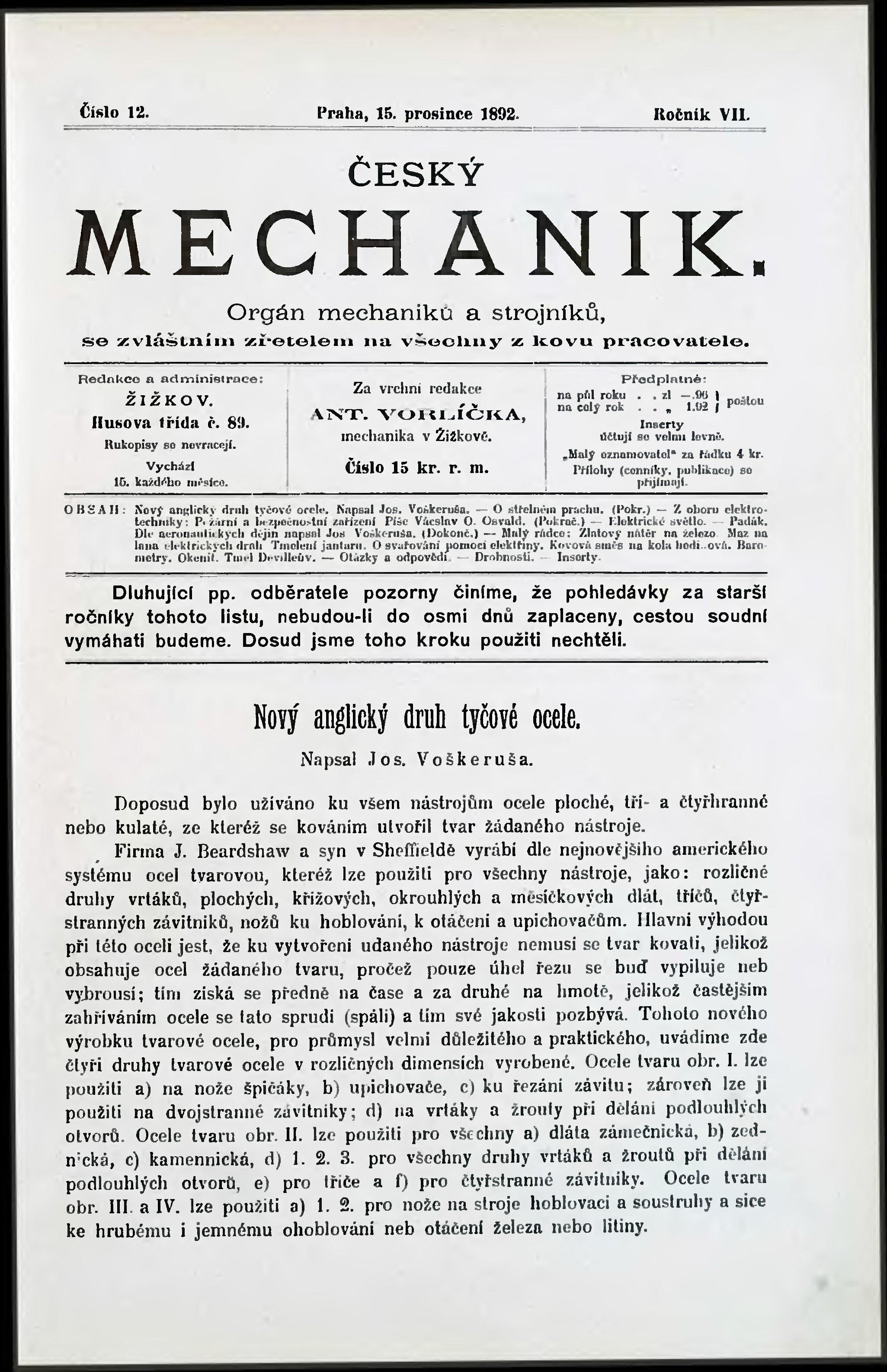 * Datum vydání výtisku: 15.12.1892 Číslo výtisku: 12