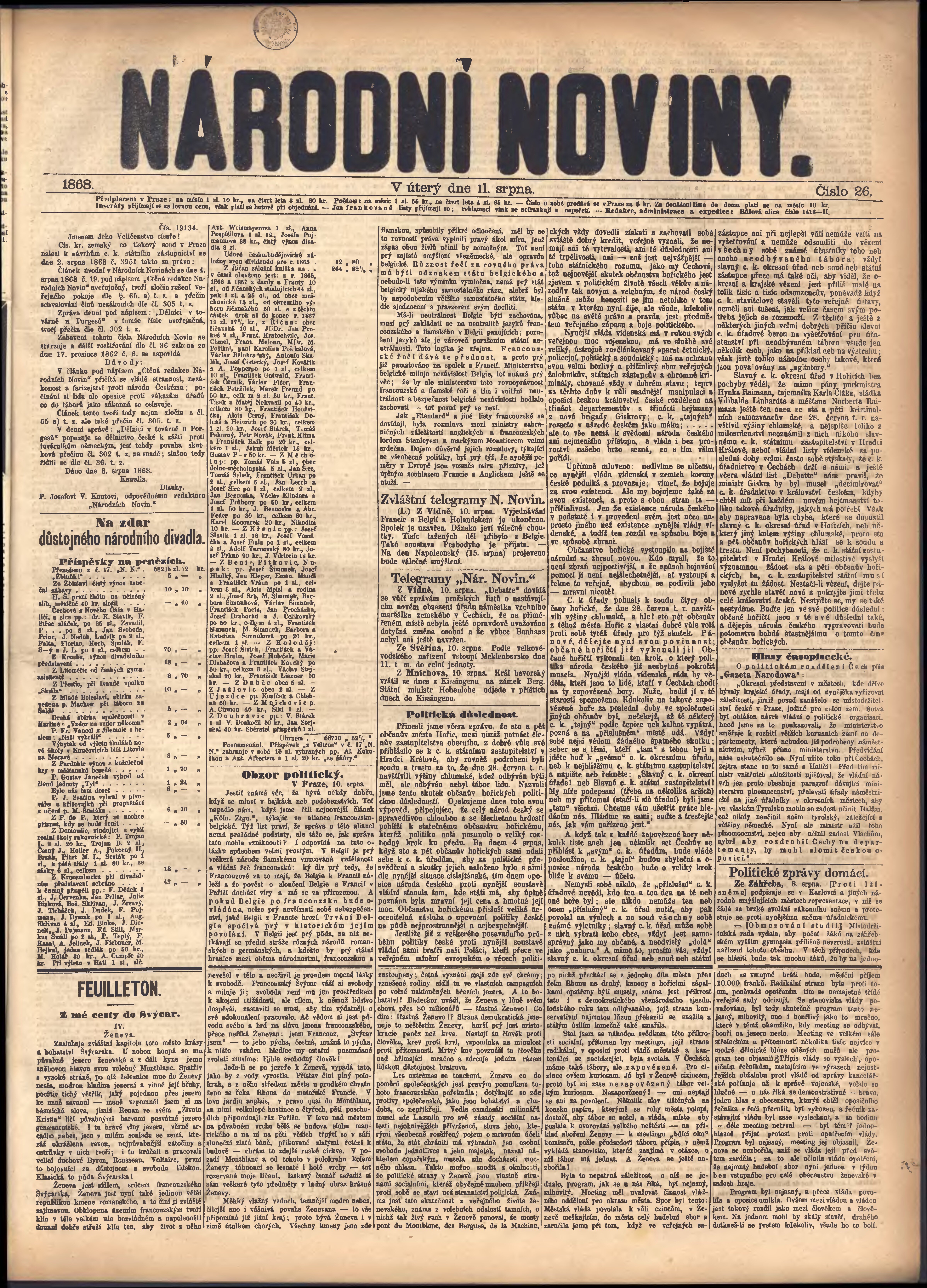 * Datum vydání výtisku: 11.8.1868 Číslo výtisku: 26