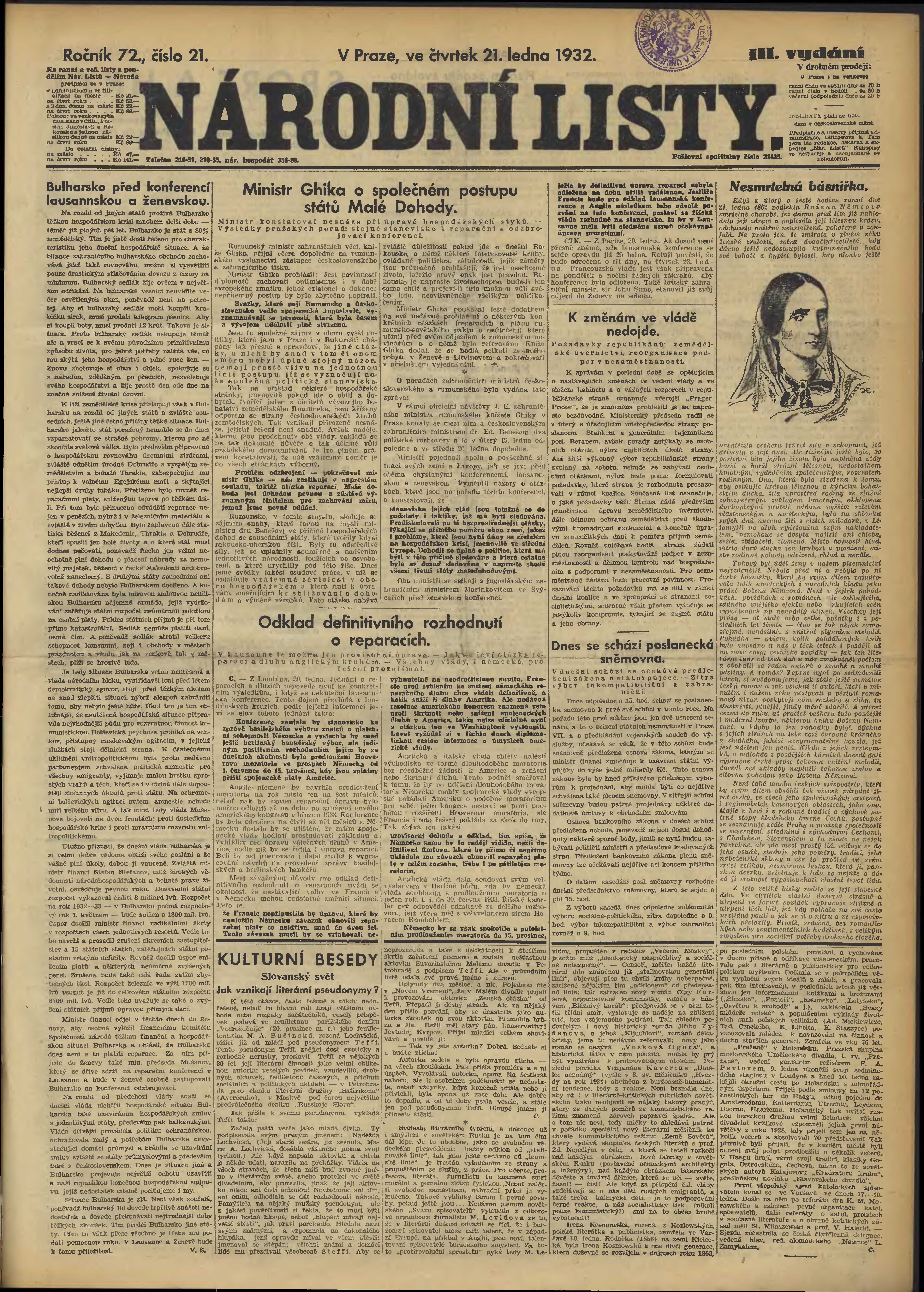 * Datum vydání výtisku: 21.1.1932 Číslo výtisku: 21