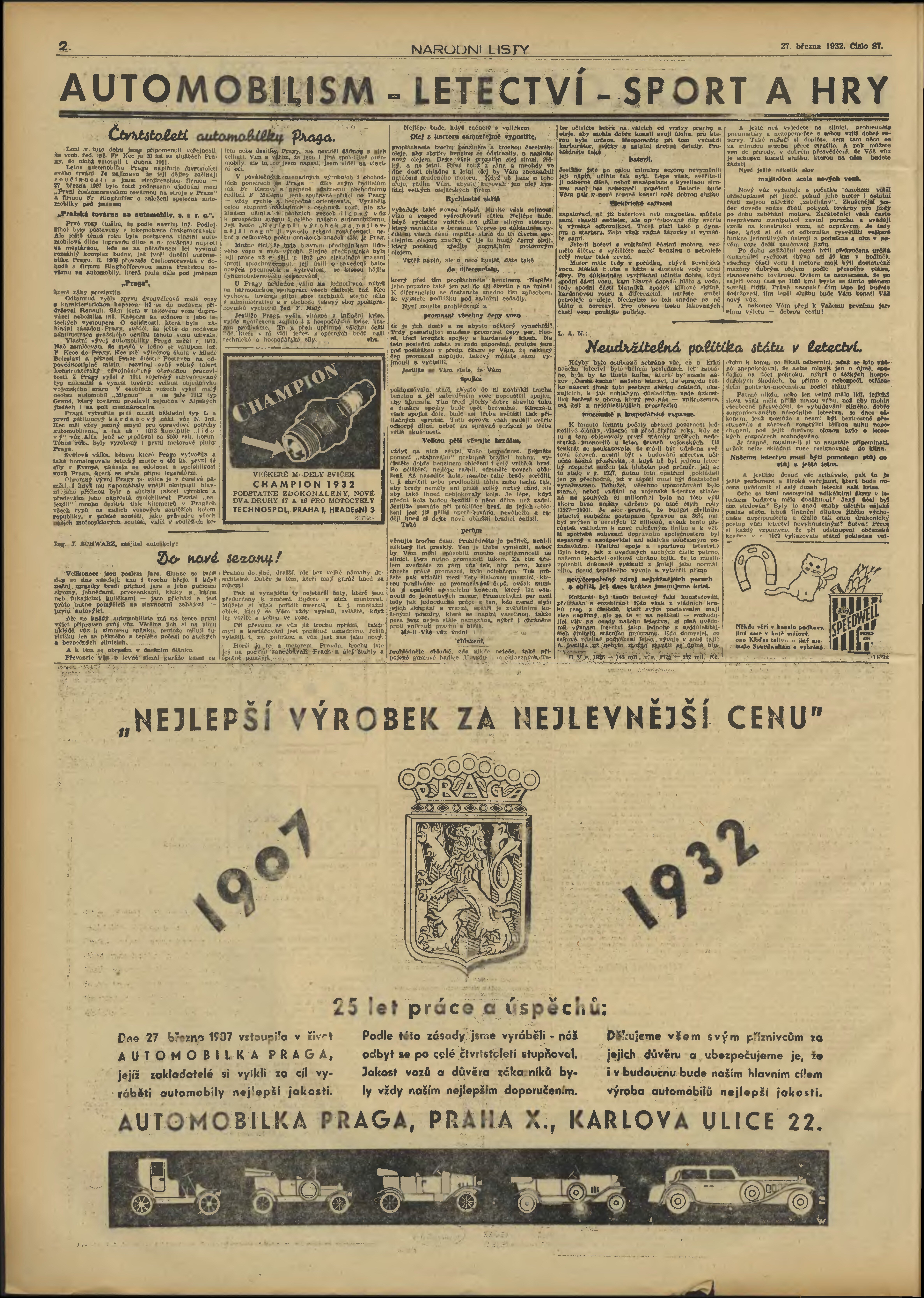 * Datum vydání výtisku: 27.3.1932 Číslo výtisku: 87 Typ výtisku: příloha