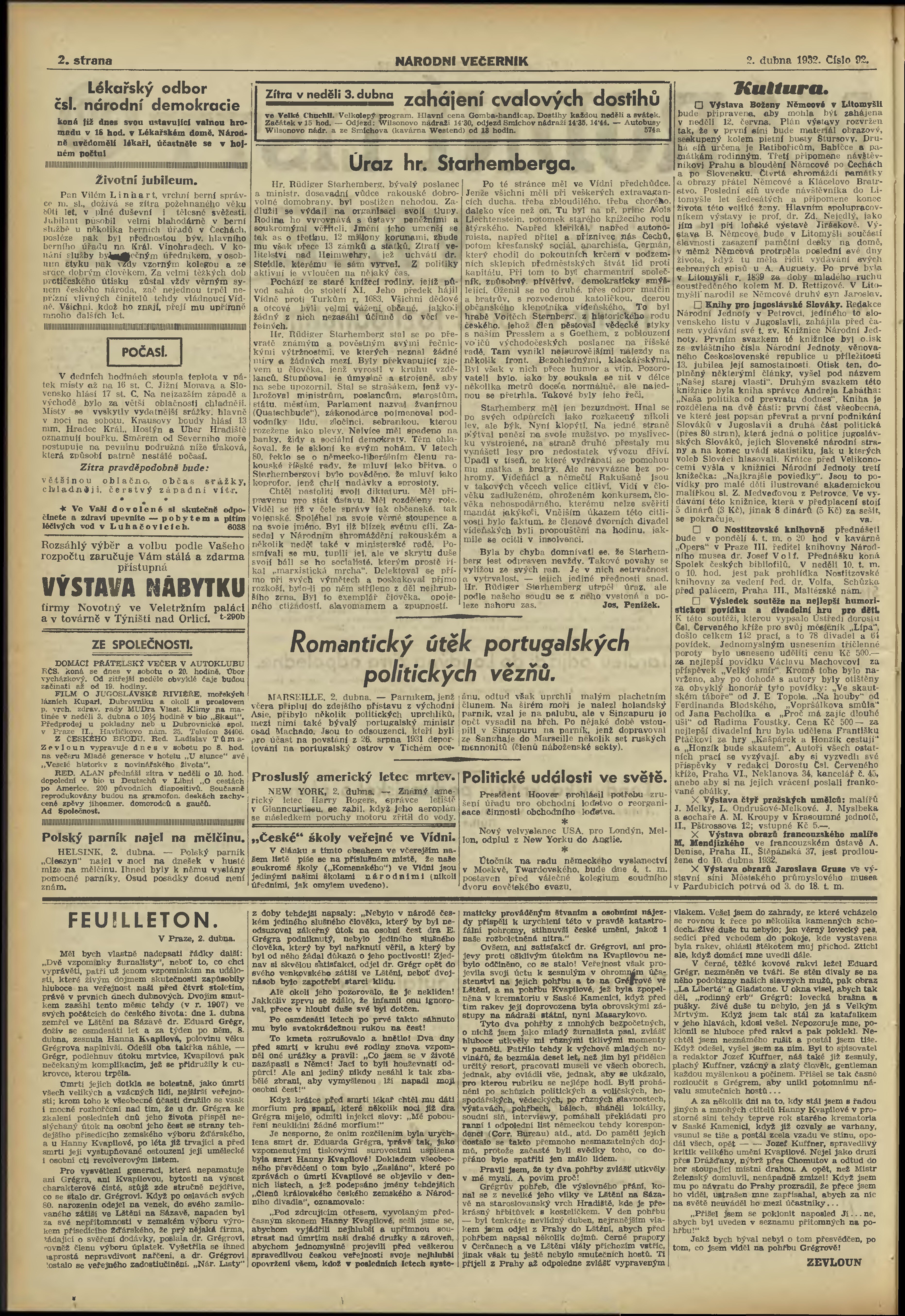 * Datum vydání výtisku: 2.4.1932 Číslo výtisku: 92 Poznámky k výtisku: večerní vydání;