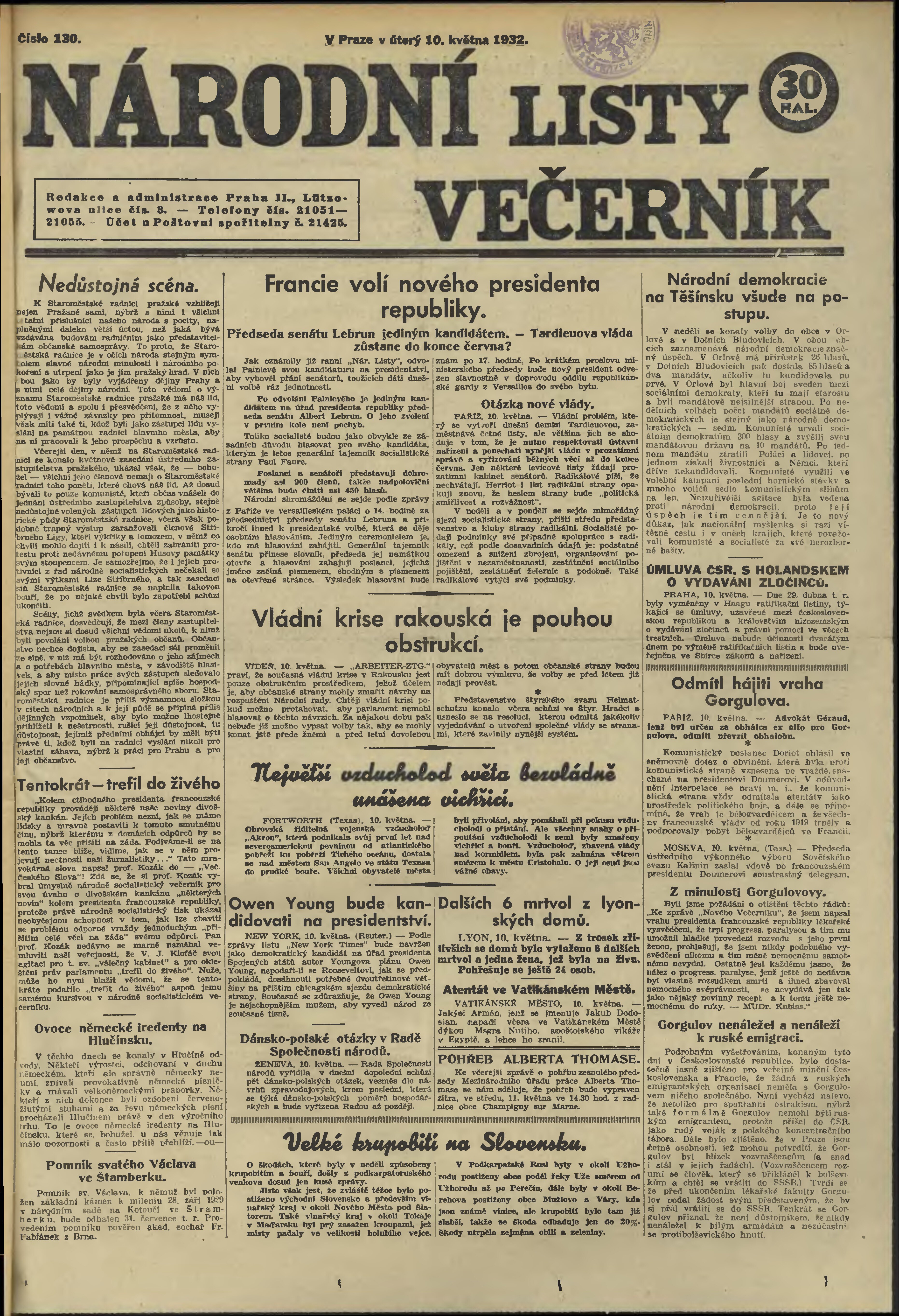 * Datum vydání výtisku: 10.5.1932 Číslo výtisku: 130 Poznámky k výtisku: večerní vydání;