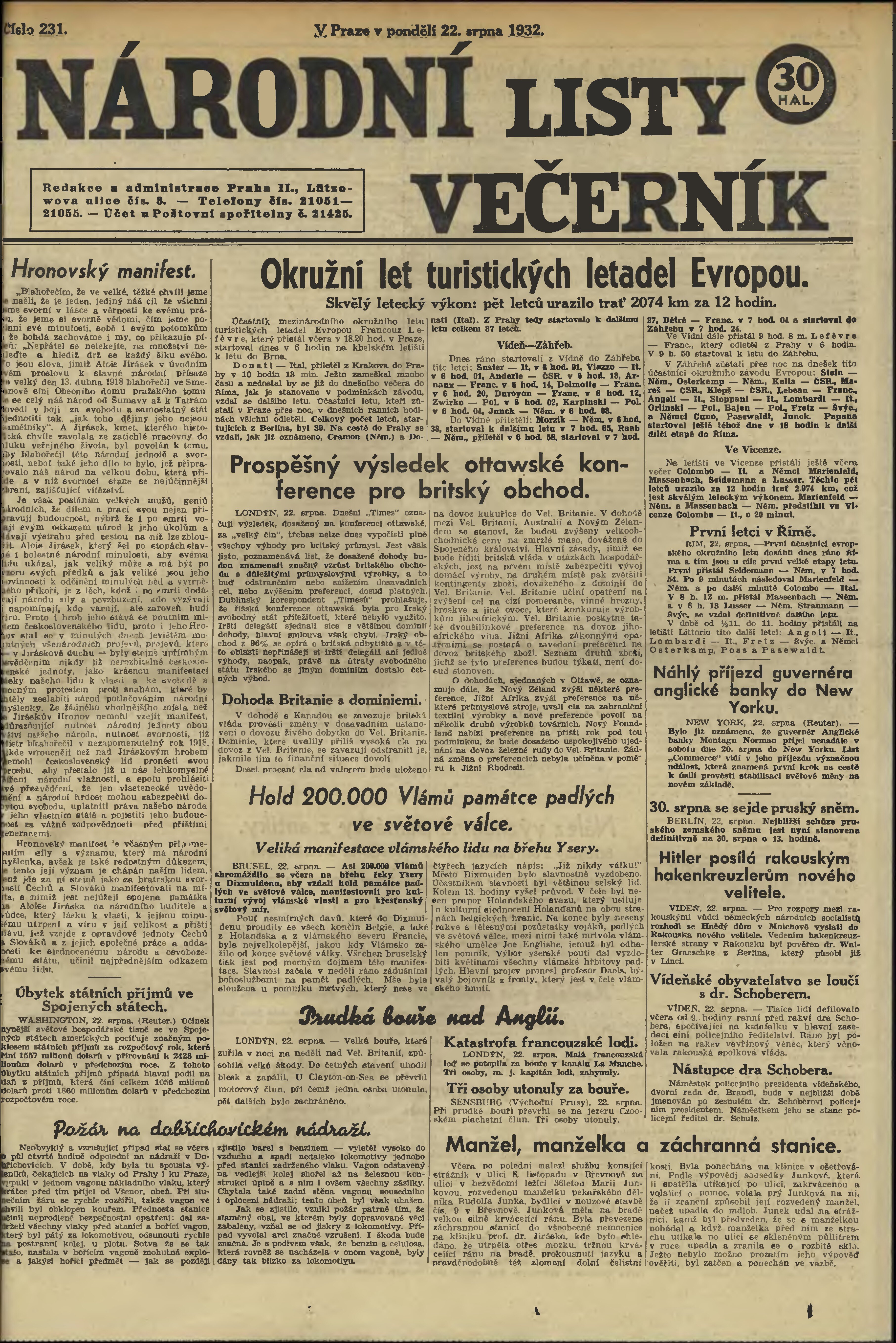 * Datum vydání výtisku: 22.8.1932 Číslo výtisku: 231 Poznámky k výtisku: večerní vydání;