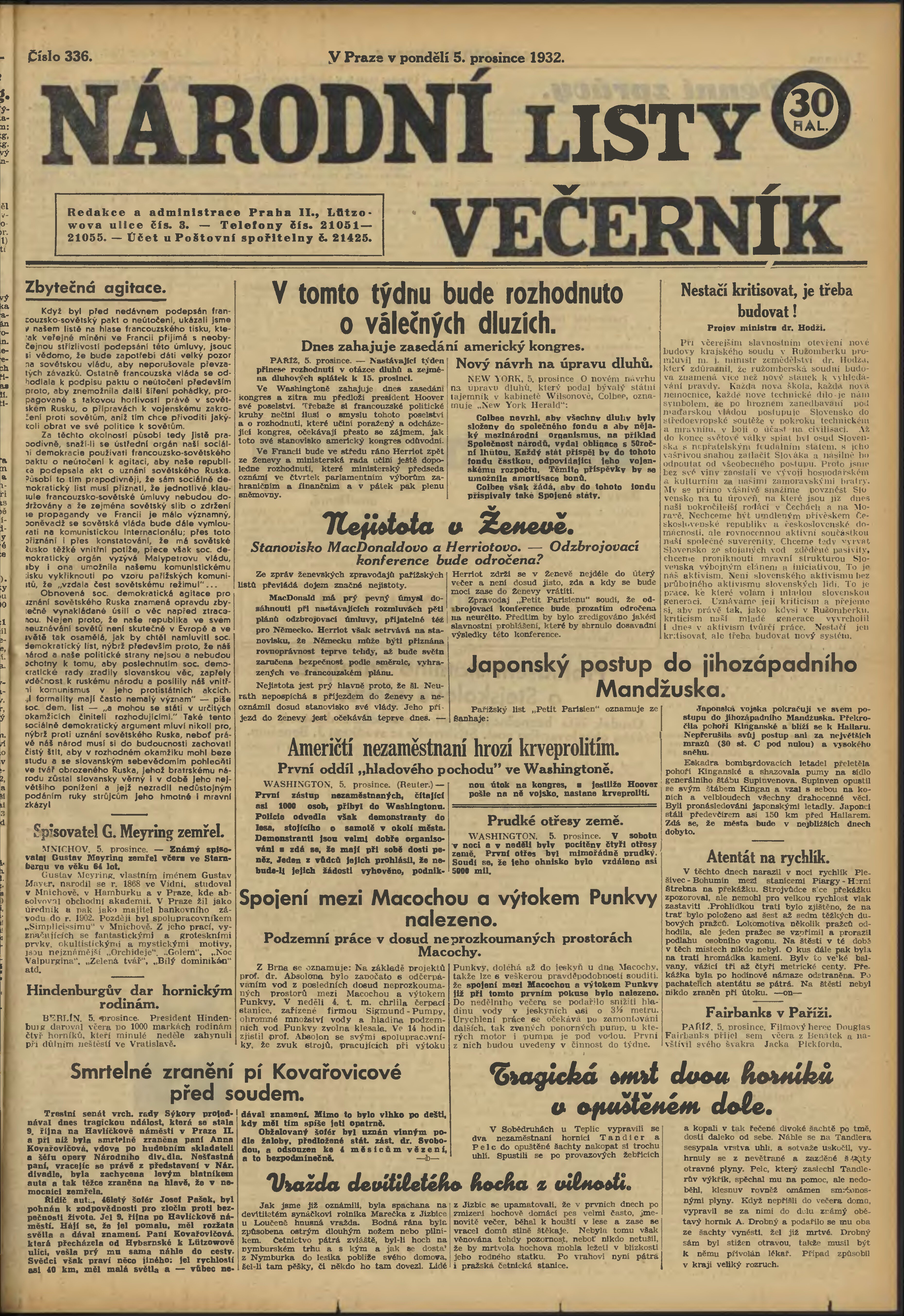 * Datum vydání výtisku: 5.12.1932 Číslo výtisku: 336 Poznámky k výtisku: večerní vydání;