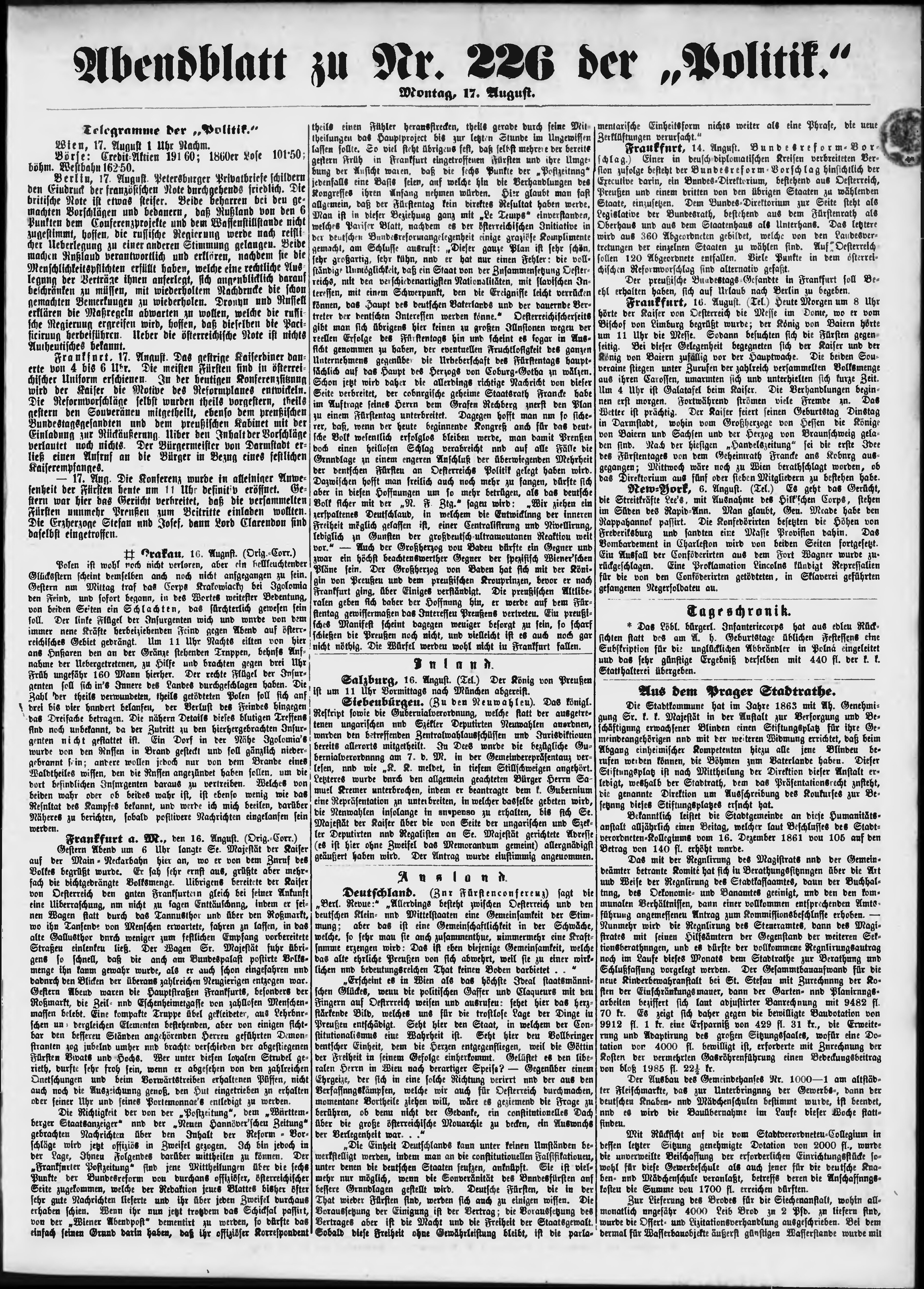 * Datum vydání výtisku: 17.8.1863 Číslo výtisku: 226 Poznámky k výtisku: večerní vydání;