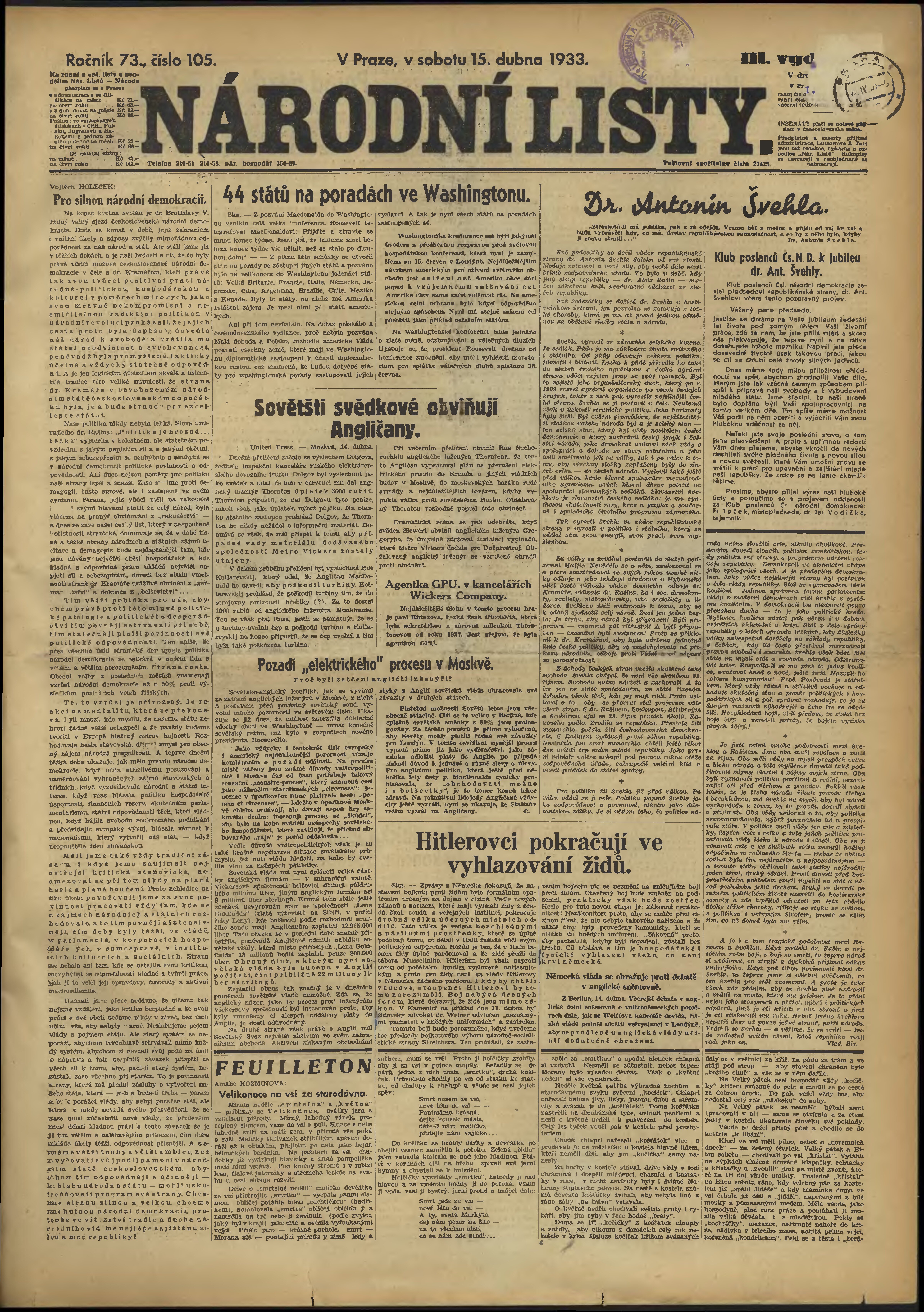 * Datum vydání výtisku: 15.4.1933 Číslo výtisku: 105