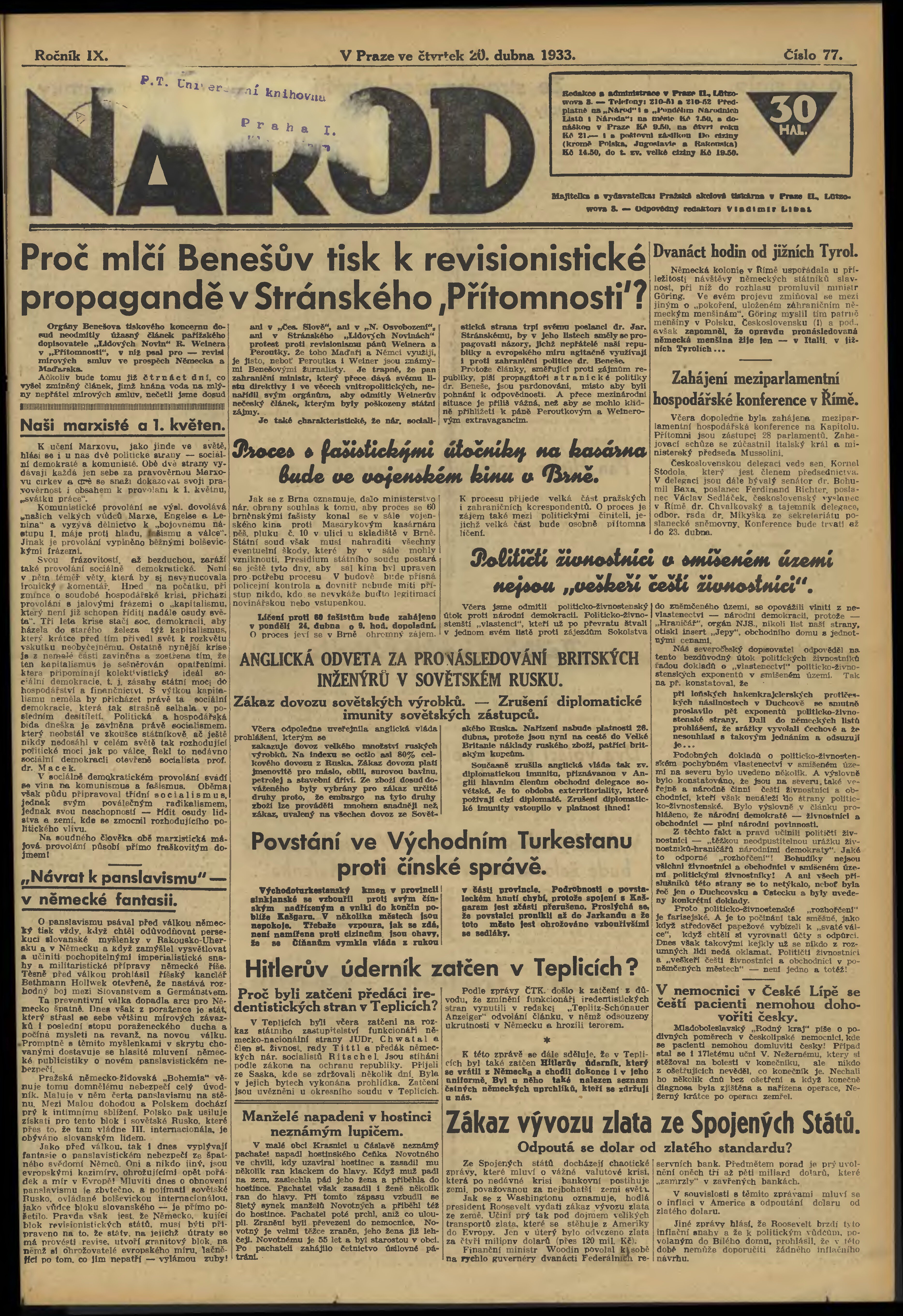 * Datum vydání výtisku: 20.4.1933 Číslo výtisku: 77
