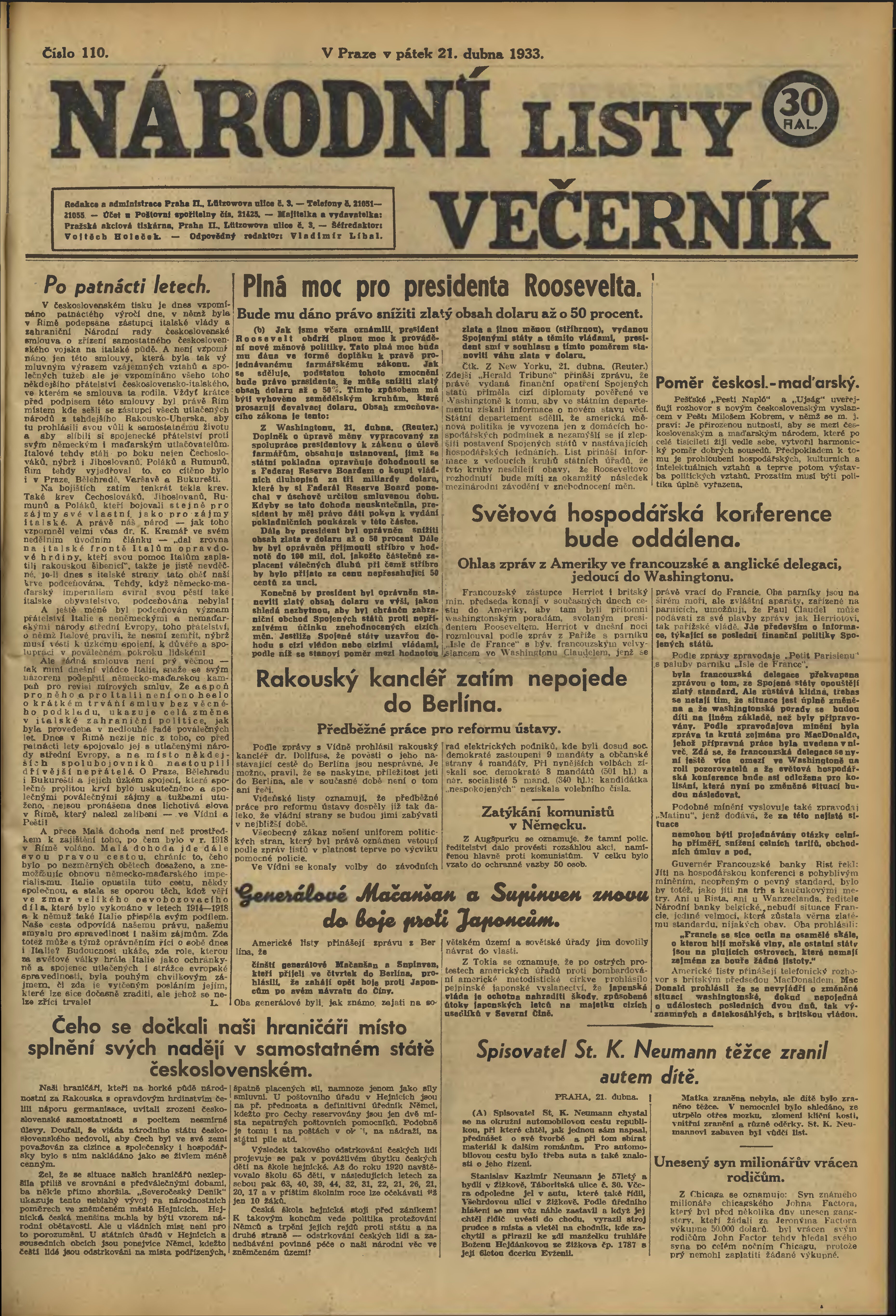 * Datum vydání výtisku: 21.4.1933 Číslo výtisku: 110 Poznámky k výtisku: večerní vydání;