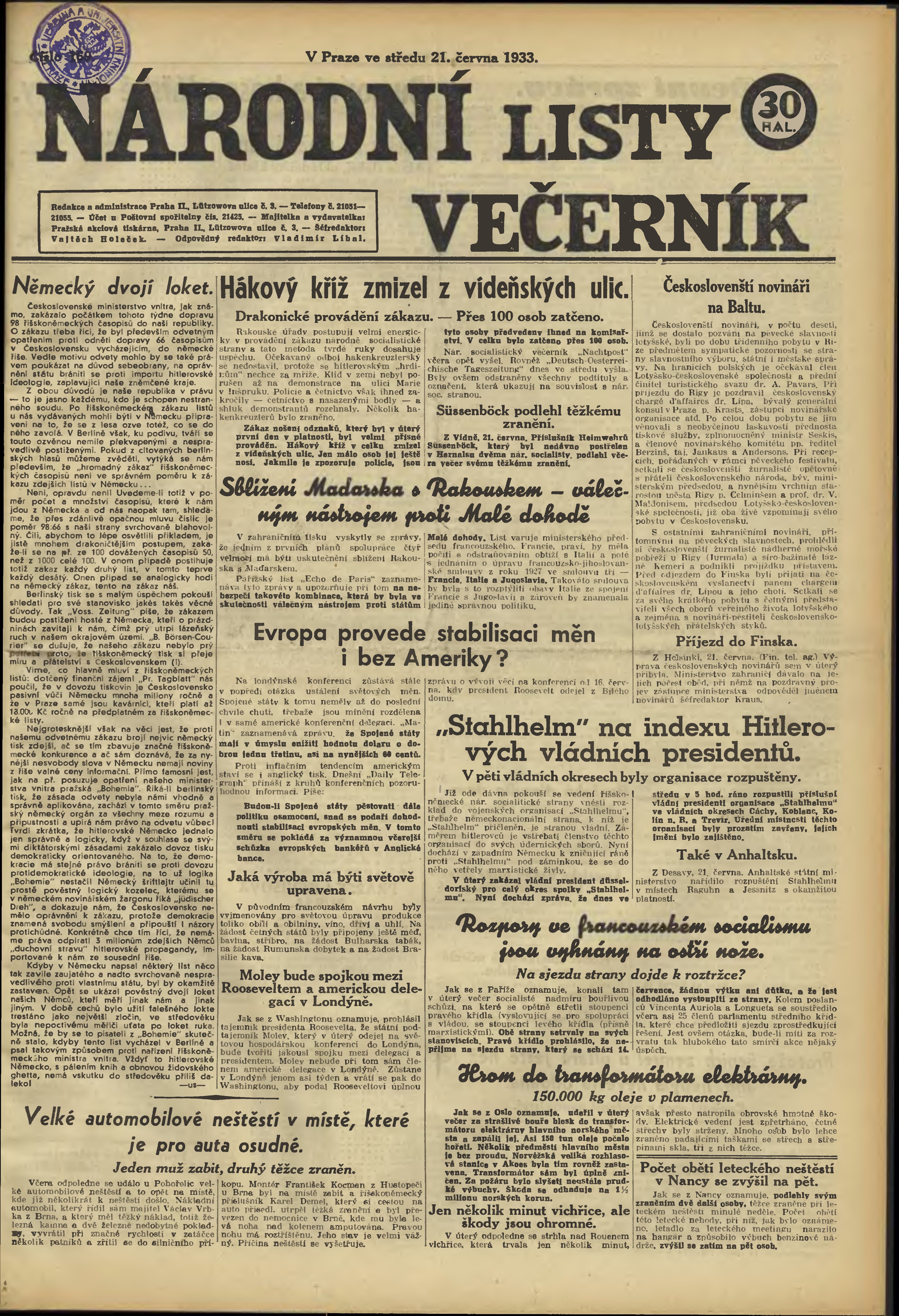 * Datum vydání výtisku: 21.6.1933 Číslo výtisku: 169 Poznámky k výtisku: večerní vydání;