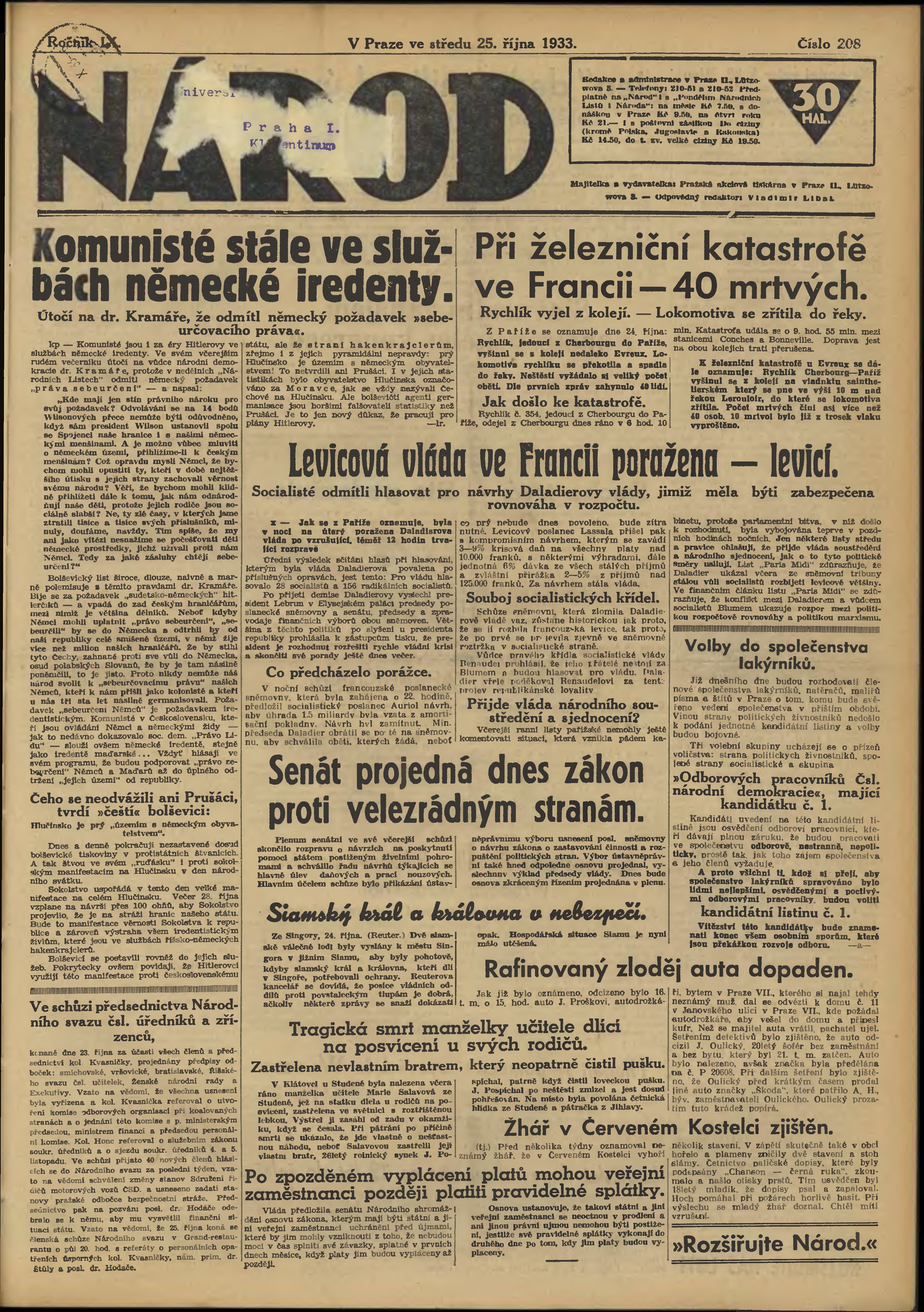 * Datum vydání výtisku: 25.10.1933 Číslo výtisku: 208