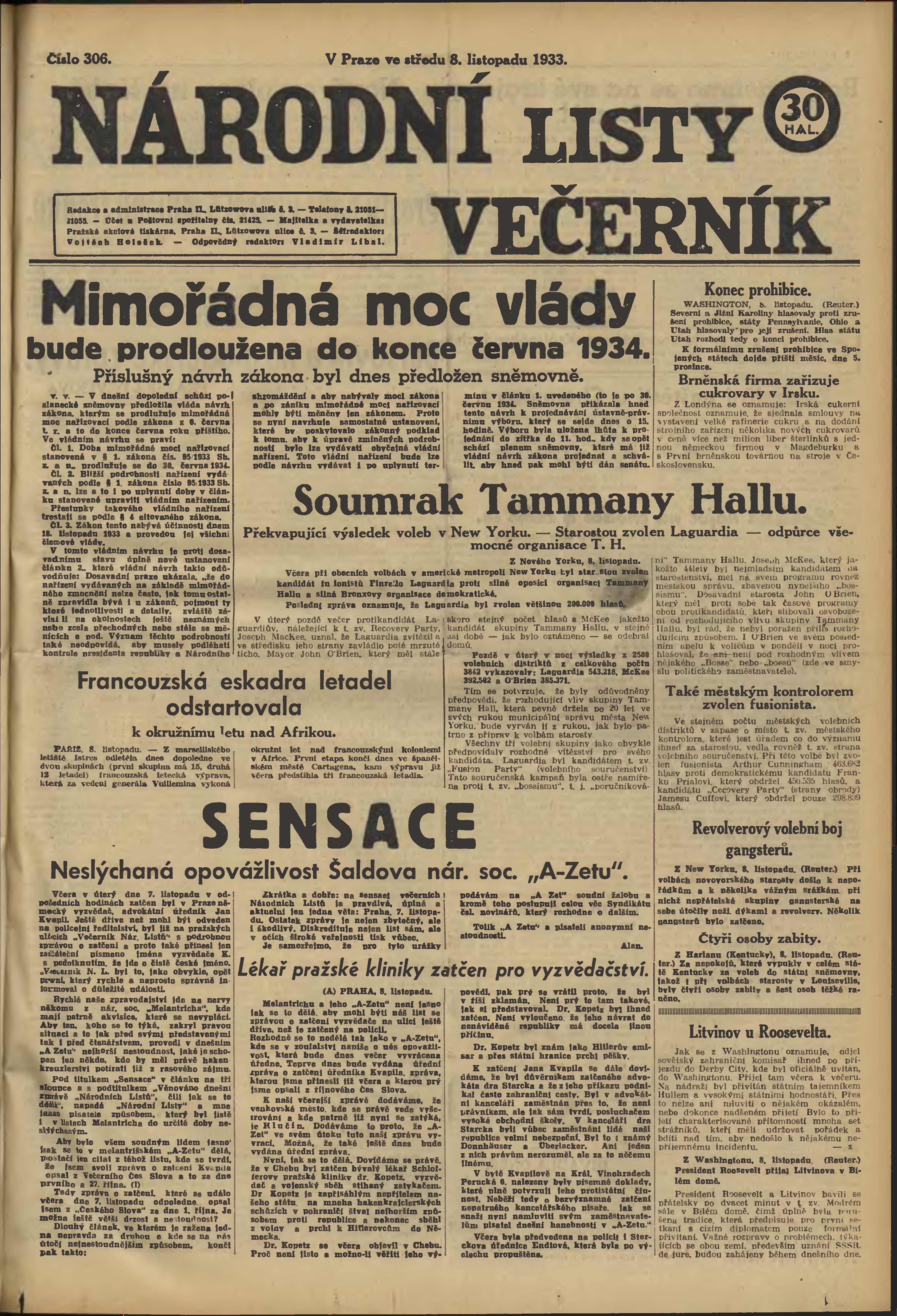 * Datum vydání výtisku: 8.11.1933 Číslo výtisku: 306 Poznámky k výtisku: večerní vydání;