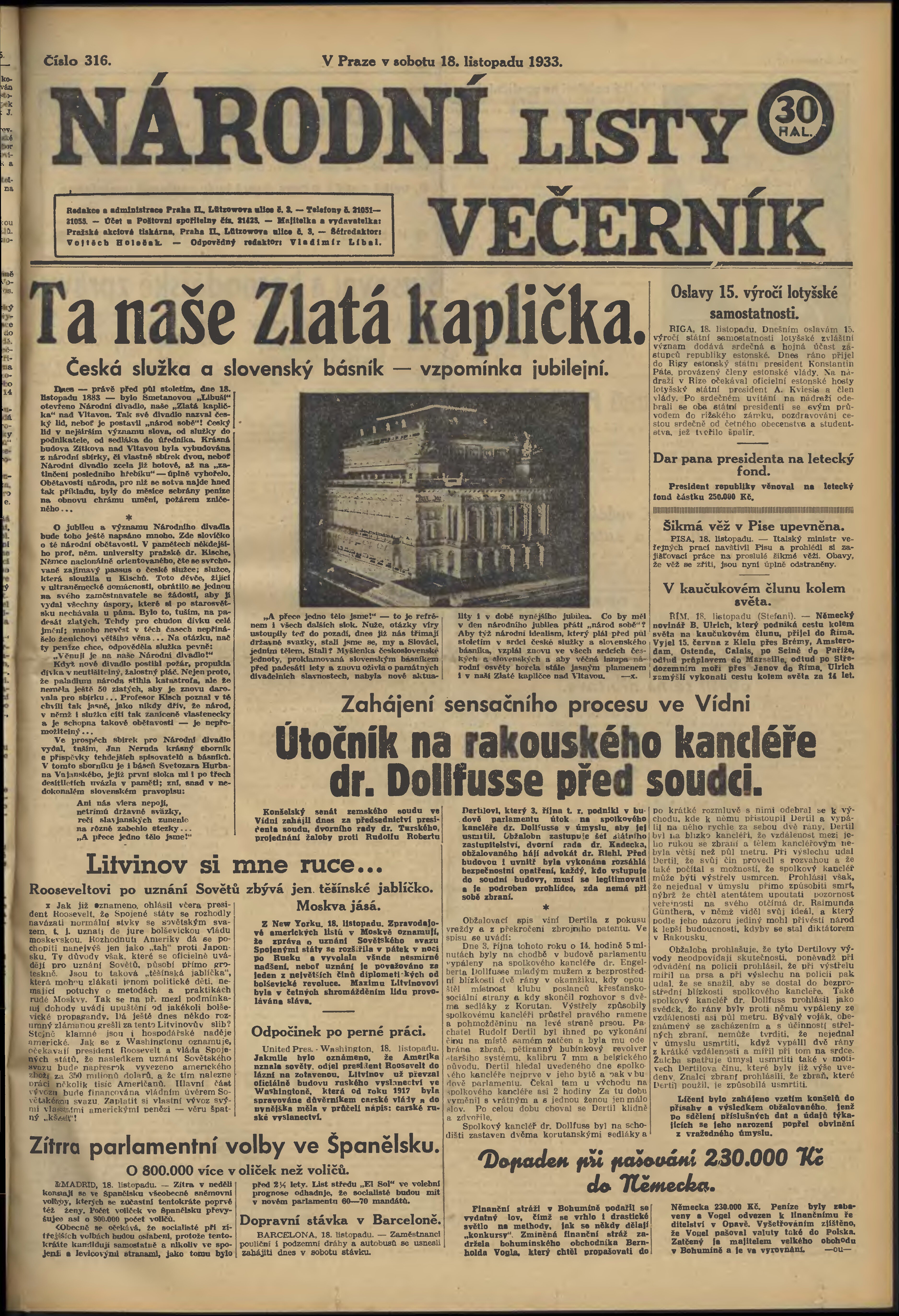 * Datum vydání výtisku: 18.11.1933 Číslo výtisku: 316 Poznámky k výtisku: večerní vydání;