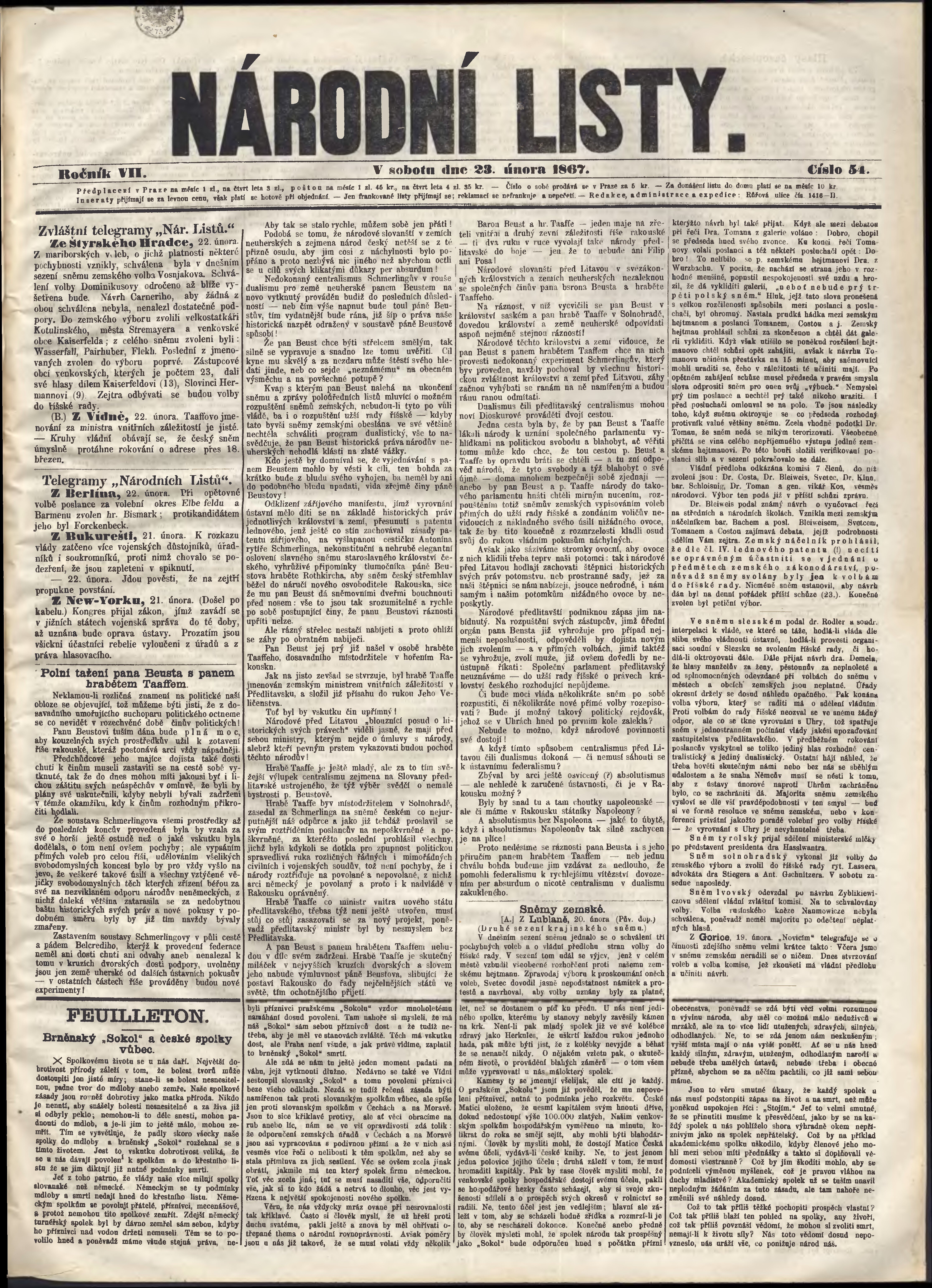 * Datum vydání výtisku: 23.2.1867 Číslo výtisku: 54