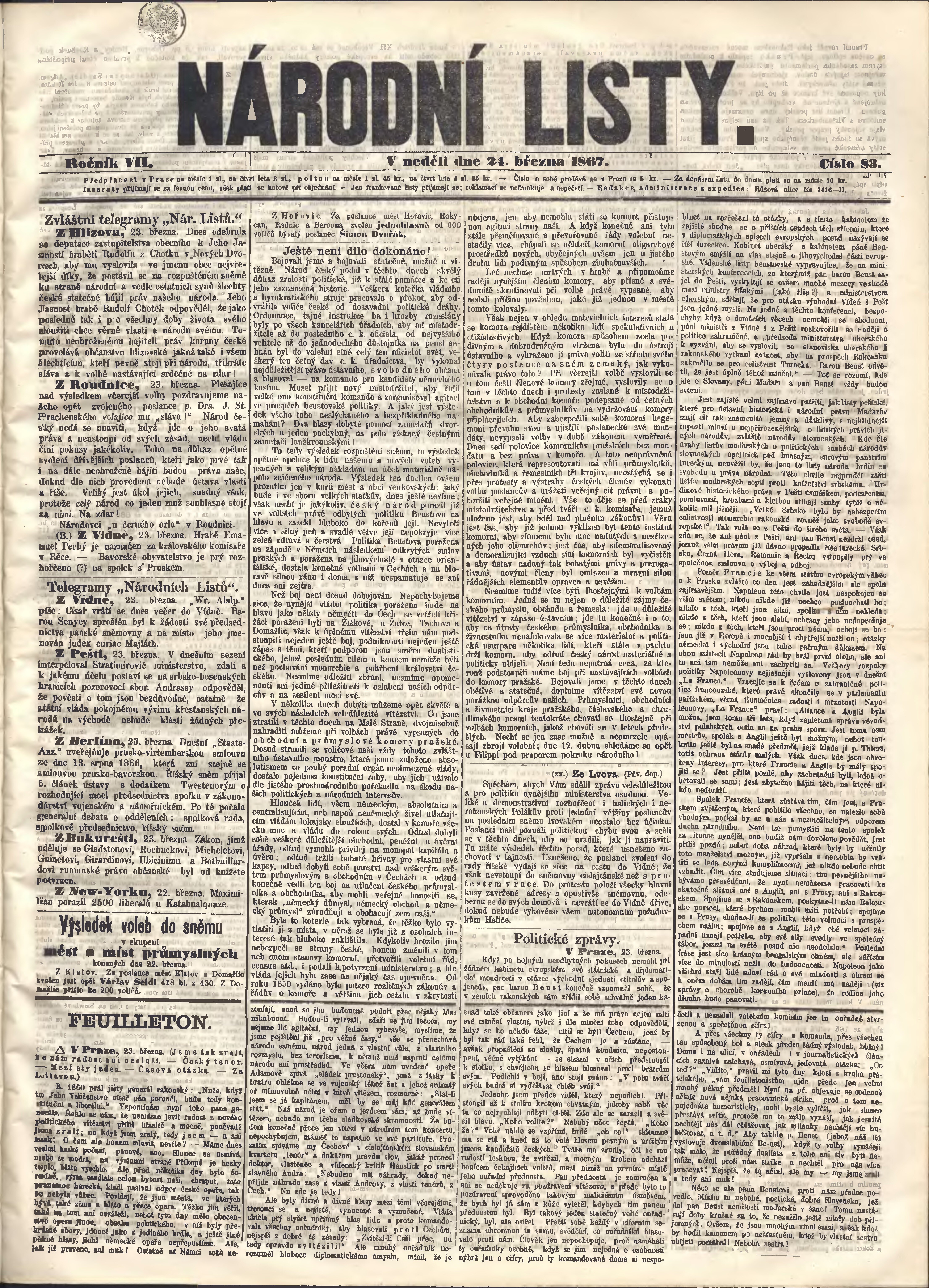 * Datum vydání výtisku: 24.3.1867 Číslo výtisku: 83