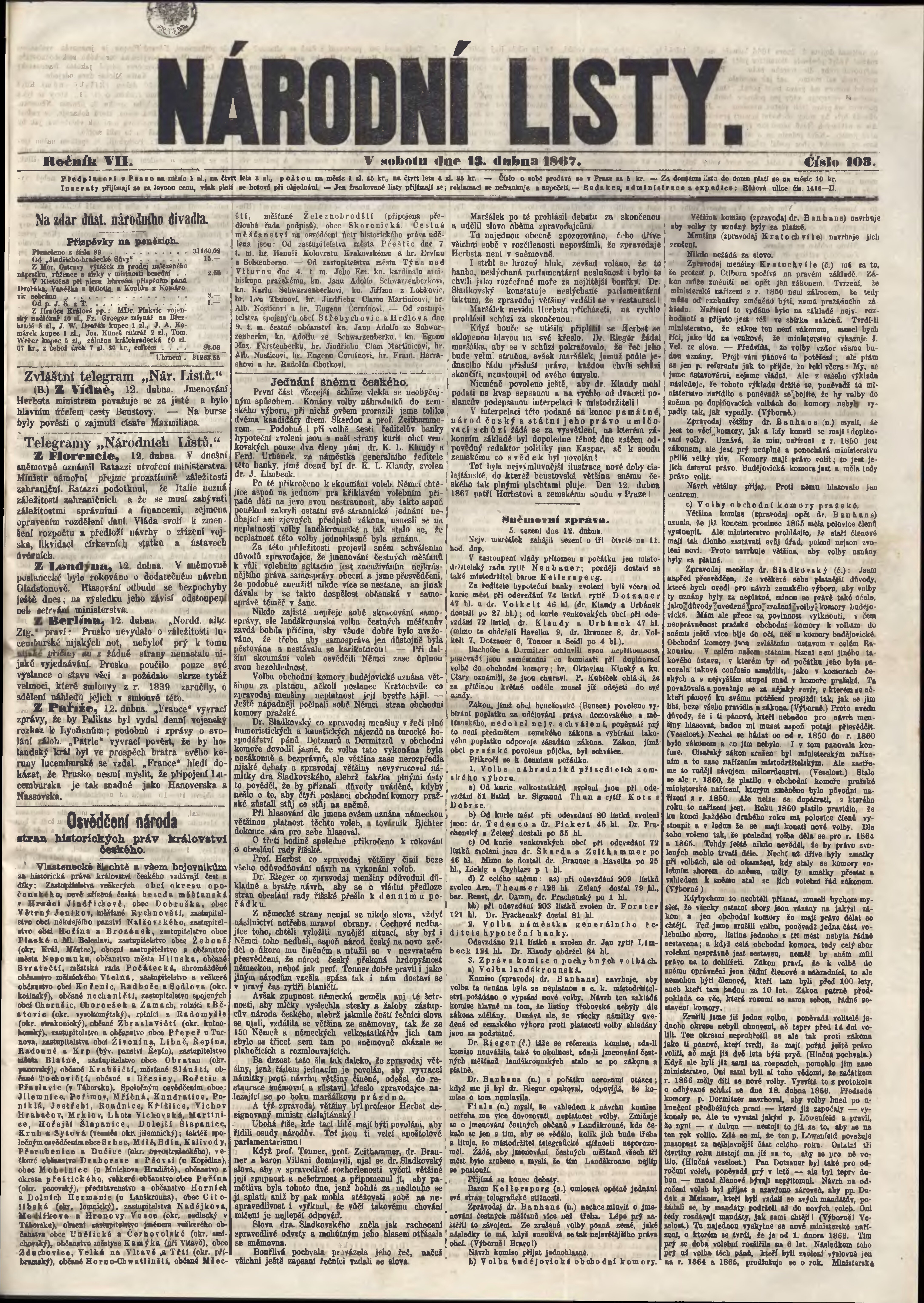 * Datum vydání výtisku: 13.4.1867 Číslo výtisku: 103