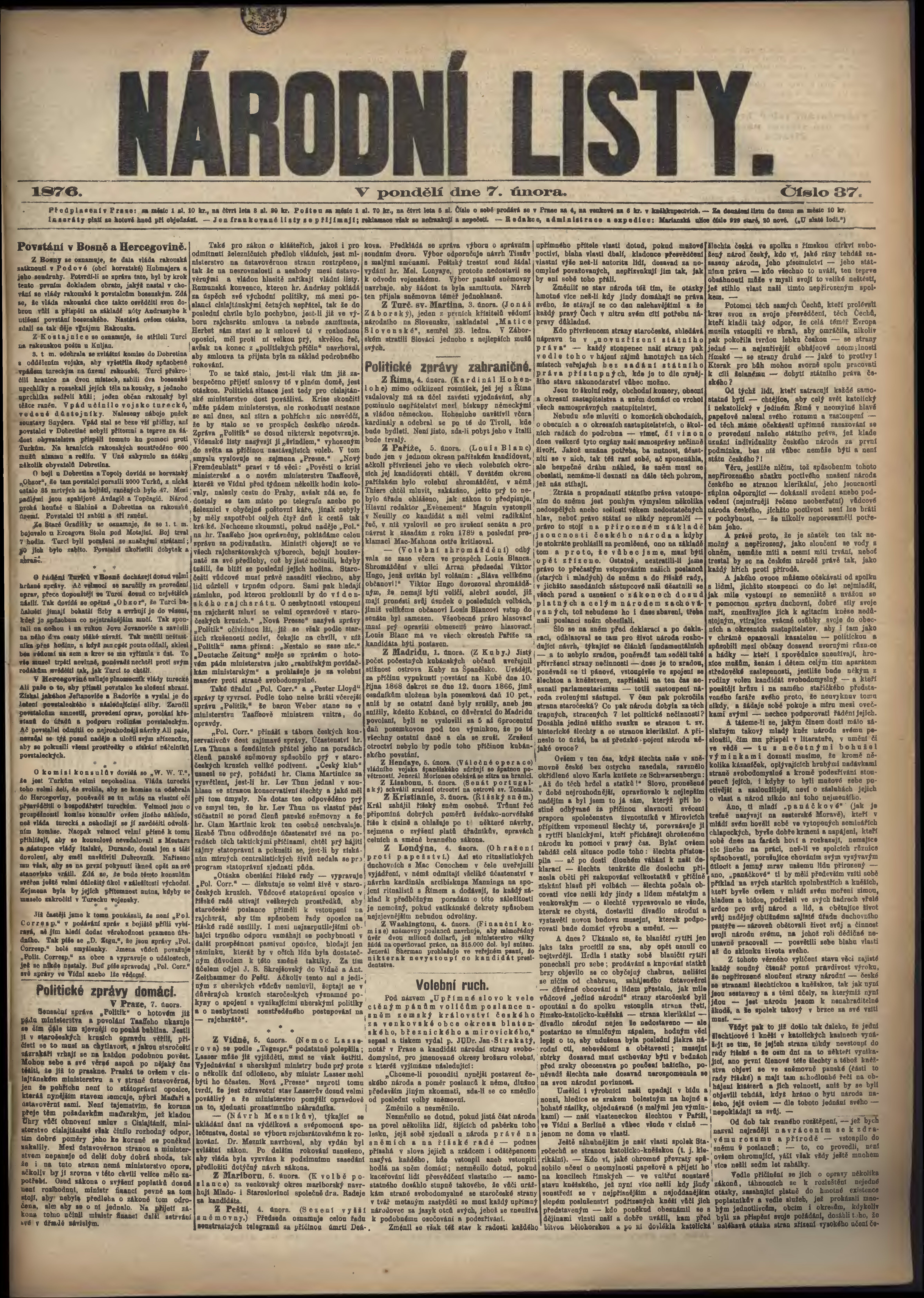 * Datum vydání výtisku: 7.2.1876 Číslo výtisku: 37