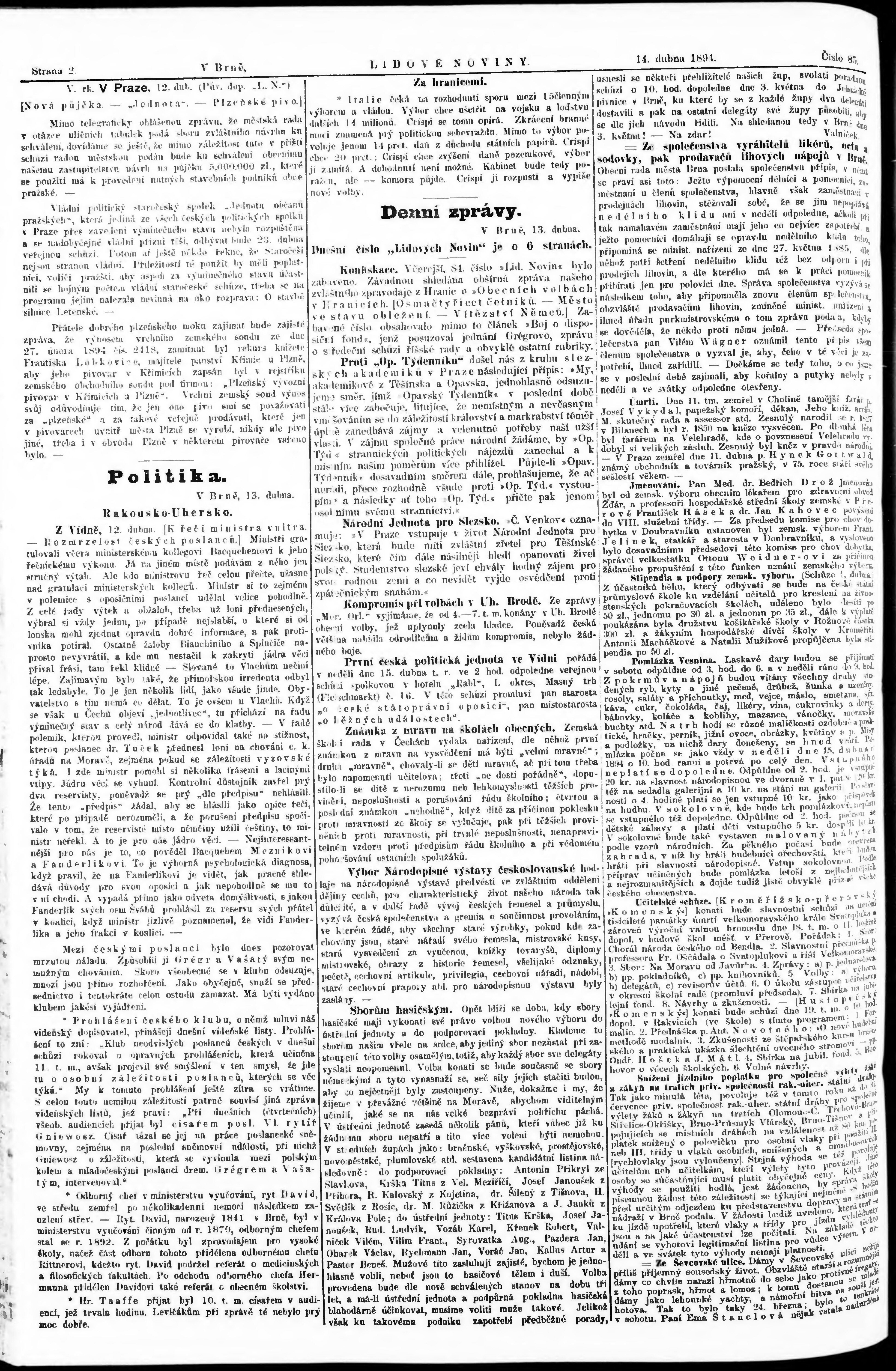 * Datum vydání výtisku: 14.4.1894 Číslo výtisku: 85 Poznámky k výtisku: poškozená předloha;