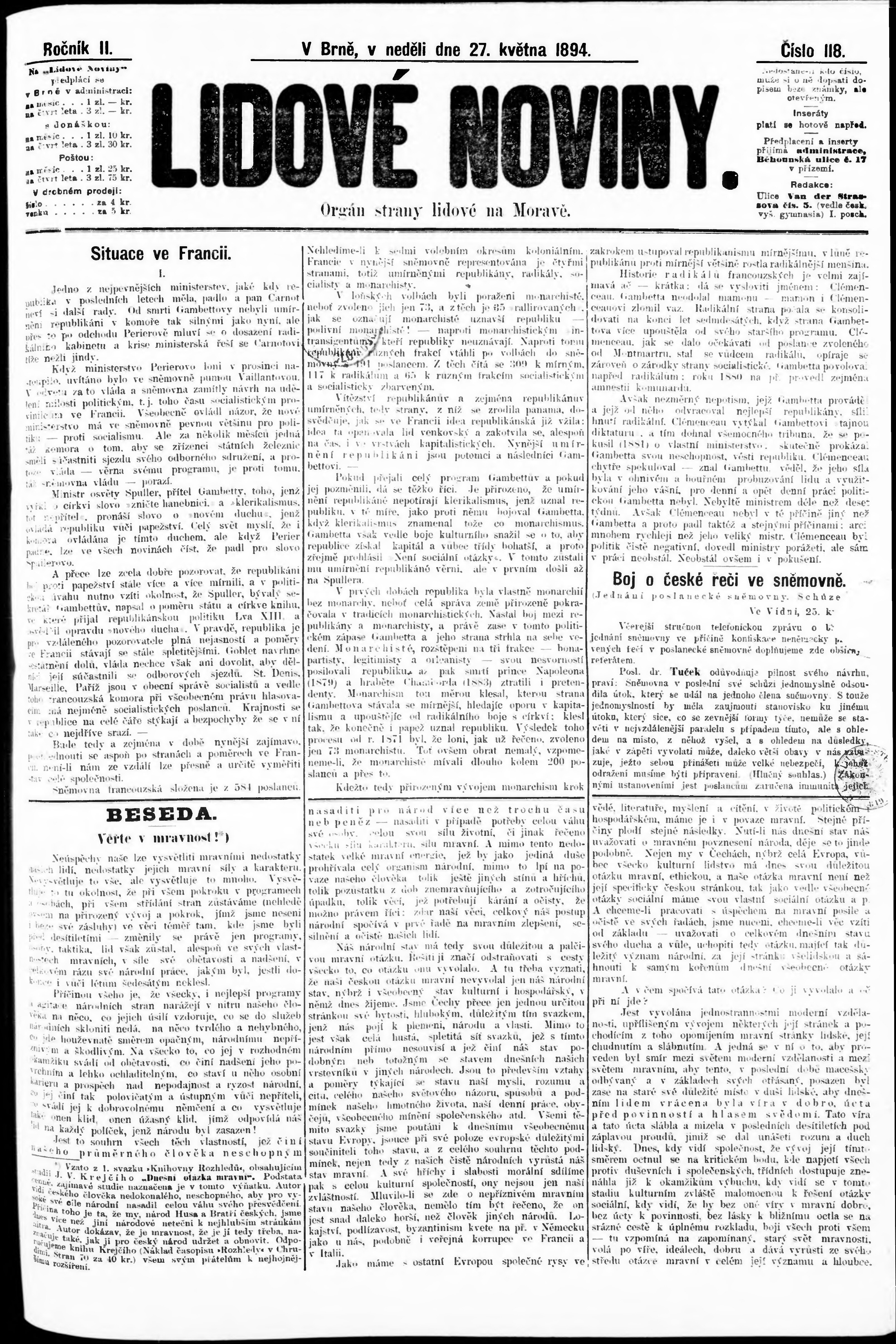 * Datum vydání výtisku: 27.5.1894 Číslo výtisku: 118 Poznámky k výtisku: s. 2 nekvalitní předloha; s. 5 poškozená předloha;