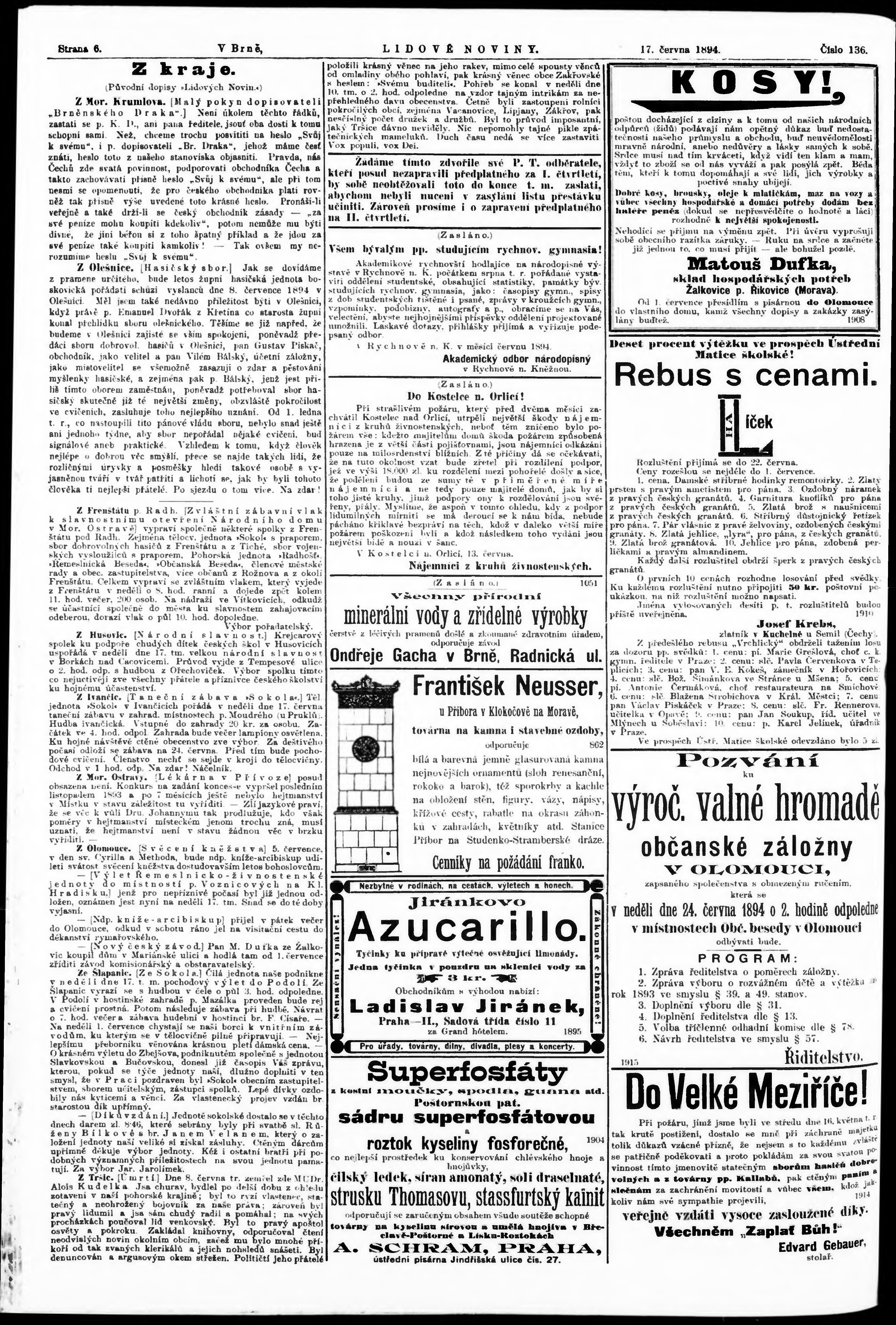 * Datum vydání výtisku: 17.6.1894 Číslo výtisku: 136 Poznámky k výtisku: poškozená předloha;