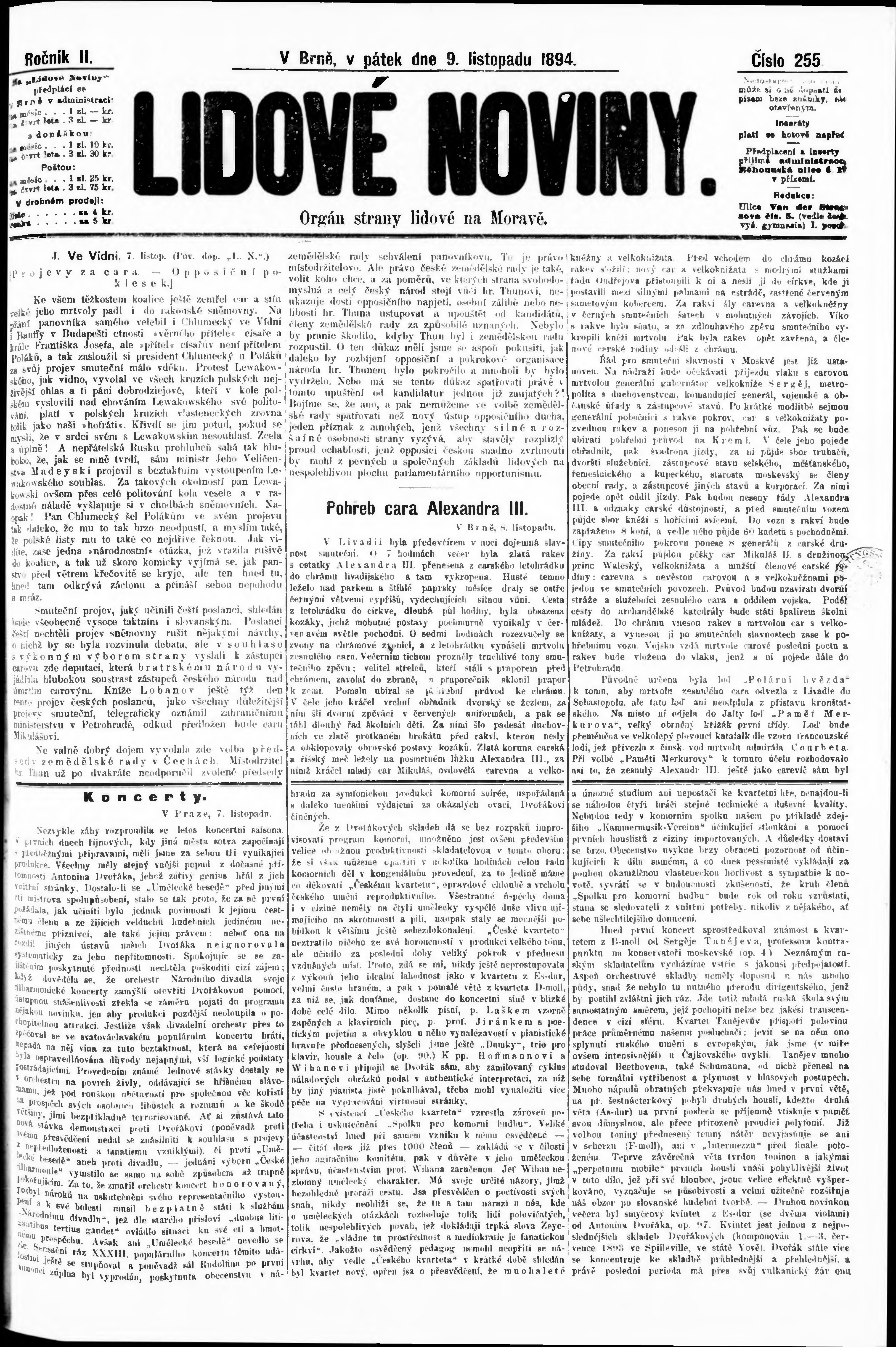 * Datum vydání výtisku: 9.11.1894 Číslo výtisku: 255
