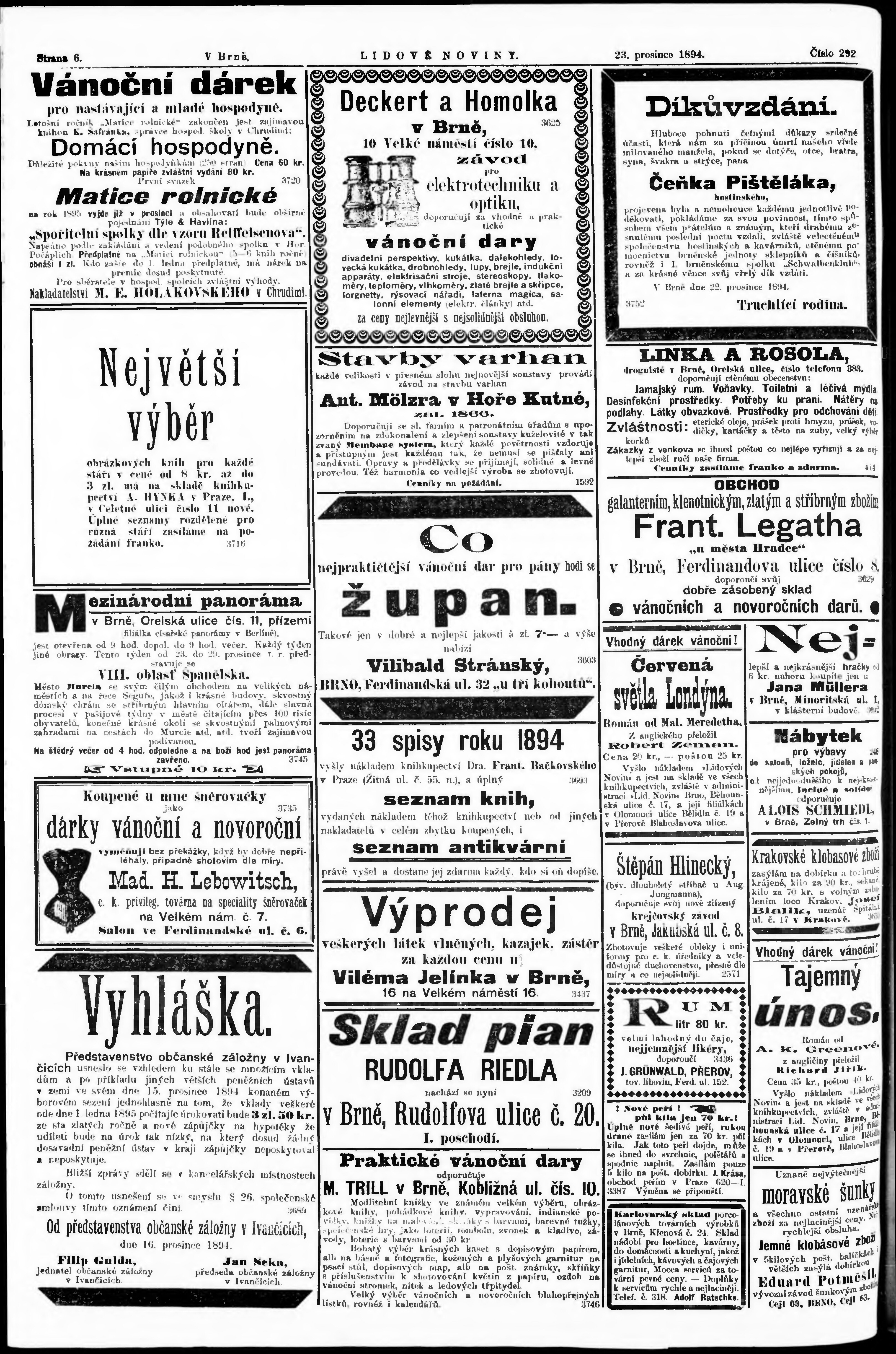 * Datum vydání výtisku: 23.12.1894 Číslo výtisku: 292 Poznámky k výtisku: s. (1), 4 - 5, 8 - 9, 16 není k dispozici;