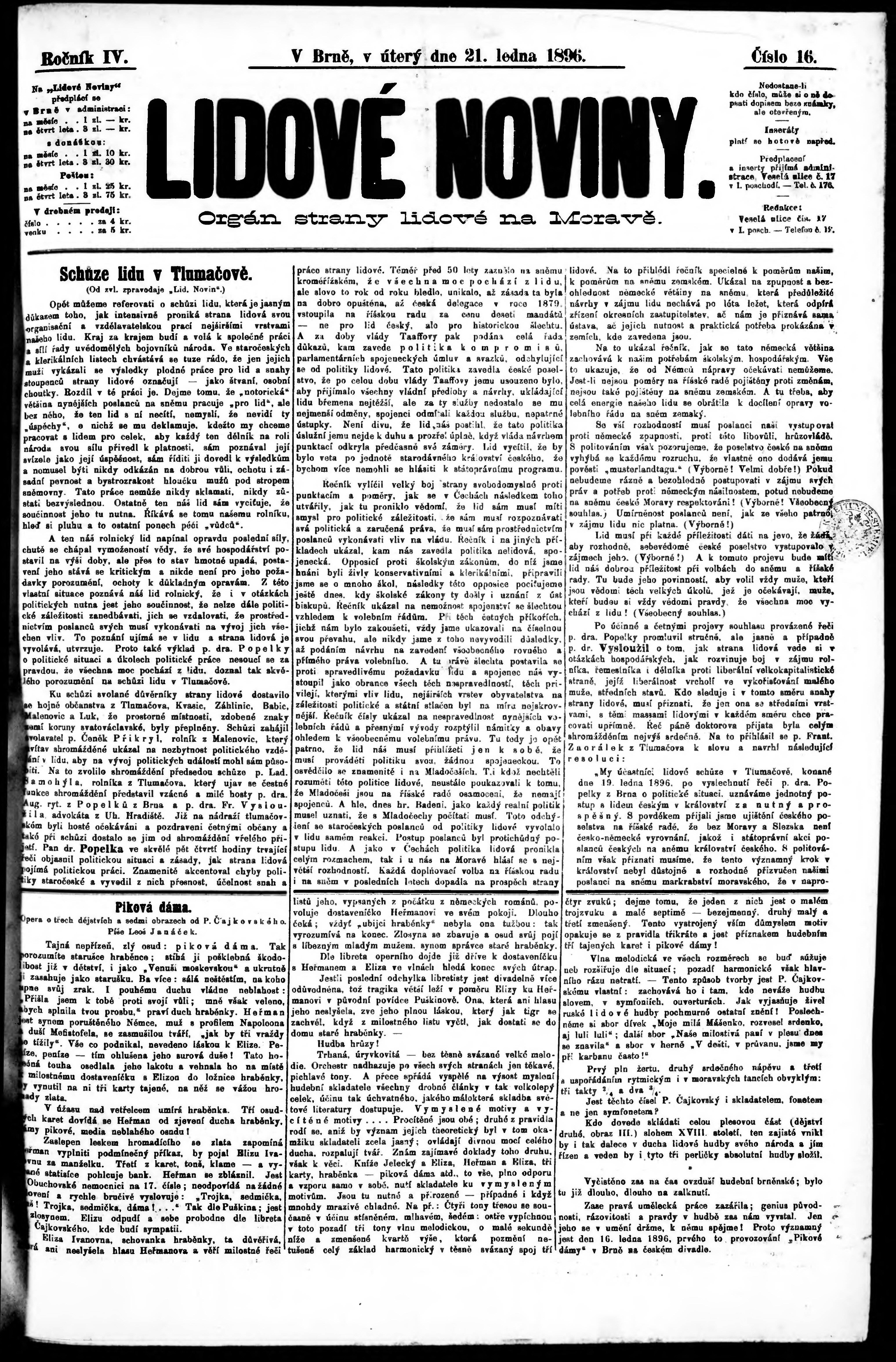 * Datum vydání výtisku: 21.1.1896 Číslo výtisku: 16 Poznámky k výtisku: s. (1), 3 poškozená předloha;