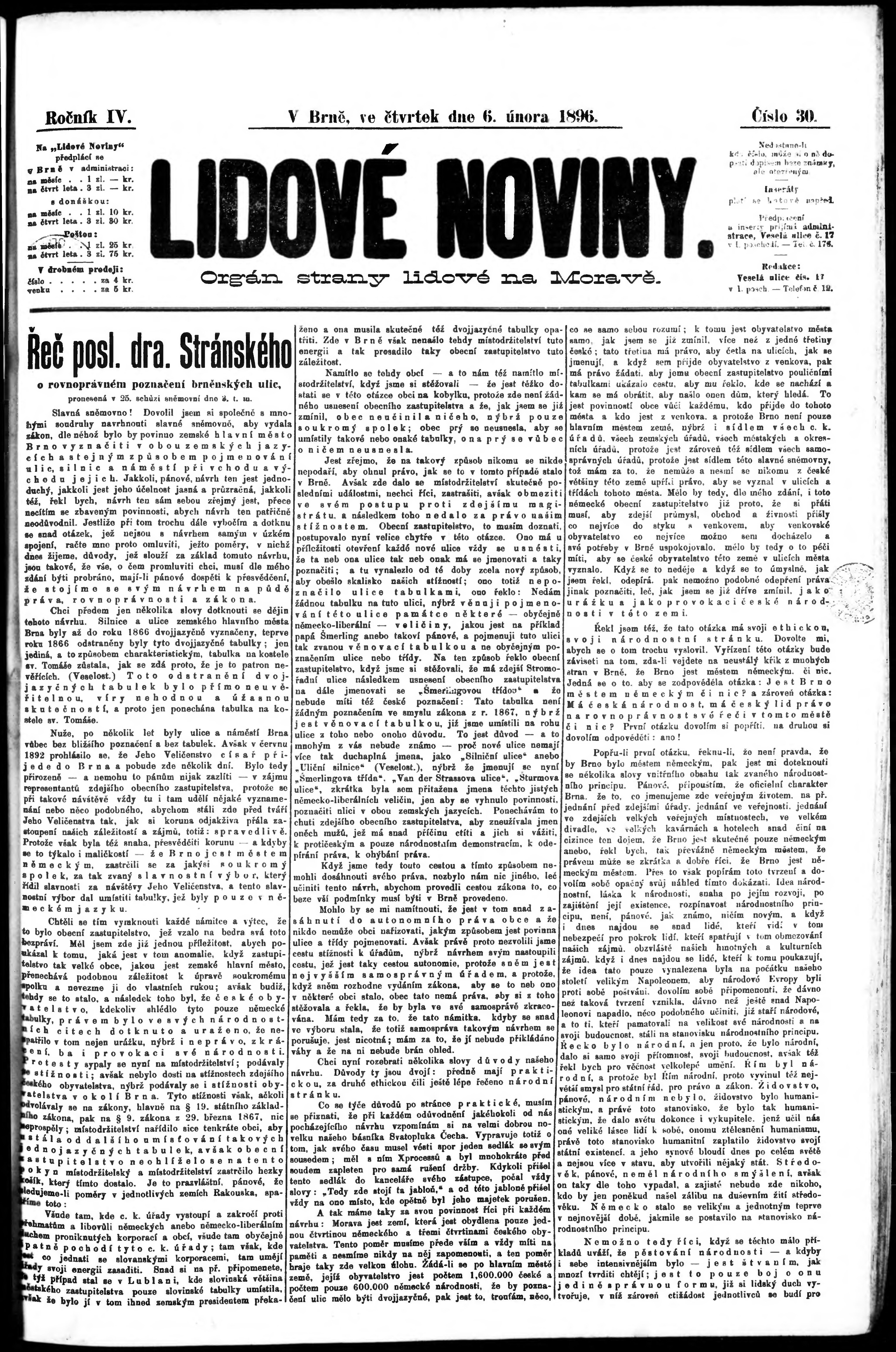 * Datum vydání výtisku: 6.2.1896 Číslo výtisku: 30 Poznámky k výtisku: obsahuje přílohu; s. (1) - 2 poškozená předloha;