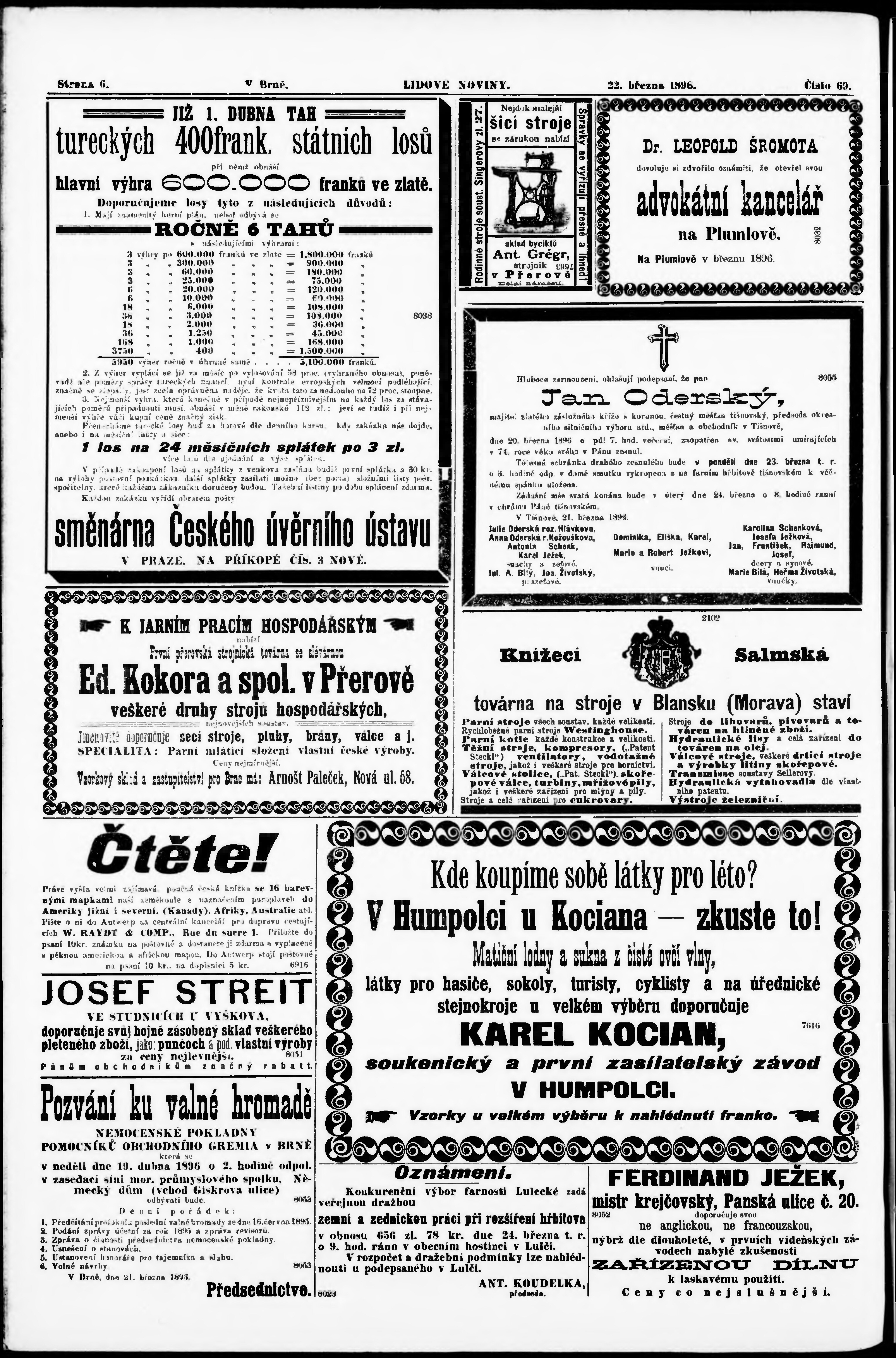 * Datum vydání výtisku: 22.3.1896 Číslo výtisku: 69 Poznámky k výtisku: s. 2 - 3 poškozená předloha;